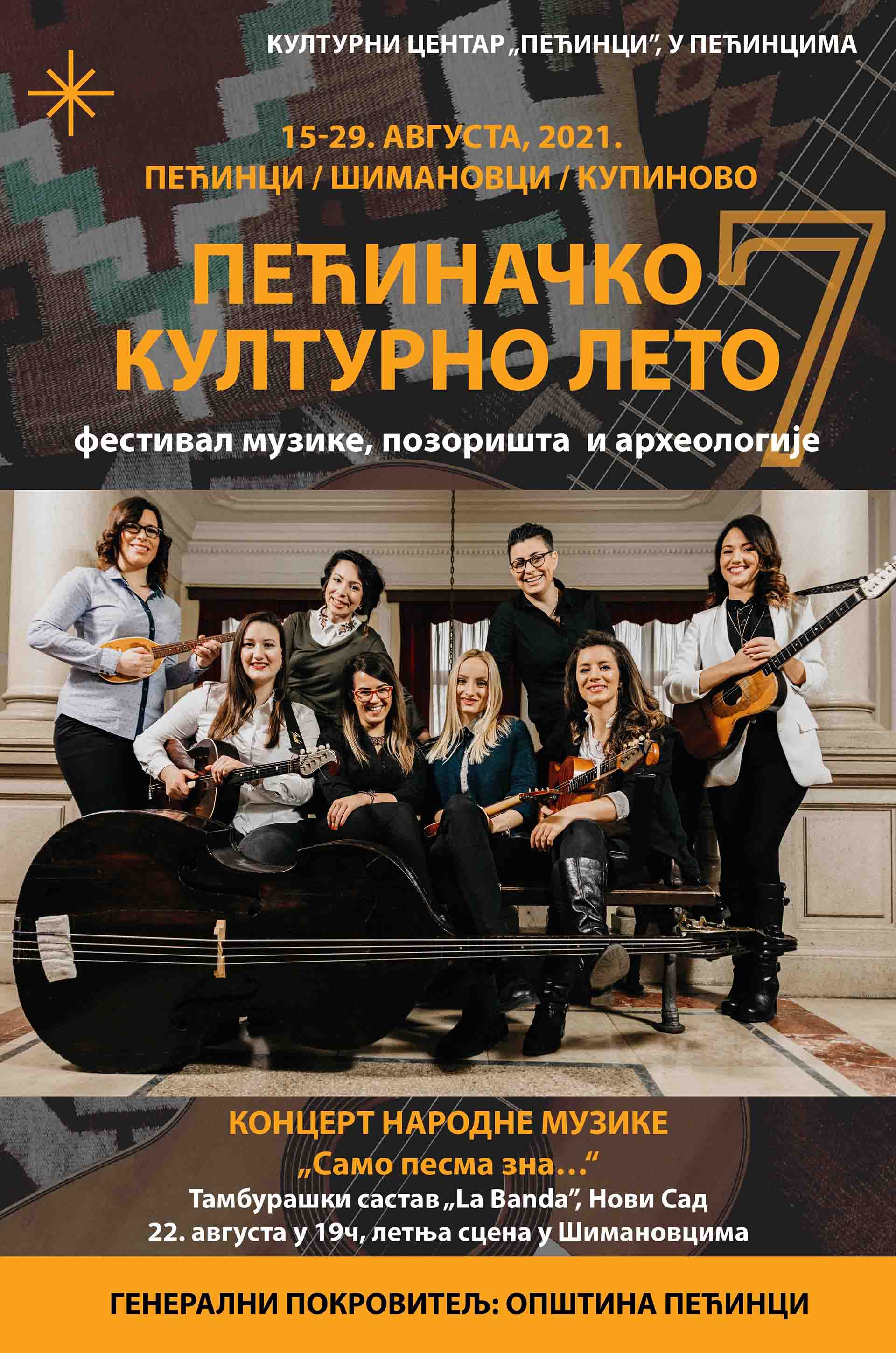 „Pećinačko kulturno leto“ koje organizuje Kulturni centar „Pećinci“ pod pokroviteljstvom pećinačke lokalne samouprave nastavlja se u nedelju 22. avgusta kada će na letnjoj sceni u Šimanovcima, u 19.00 časova nastupiti članice Tamburaškog sastava „La banda“ iz Novog Sada u okviru Koncerta narodne muzike „Samo pesma zna“.