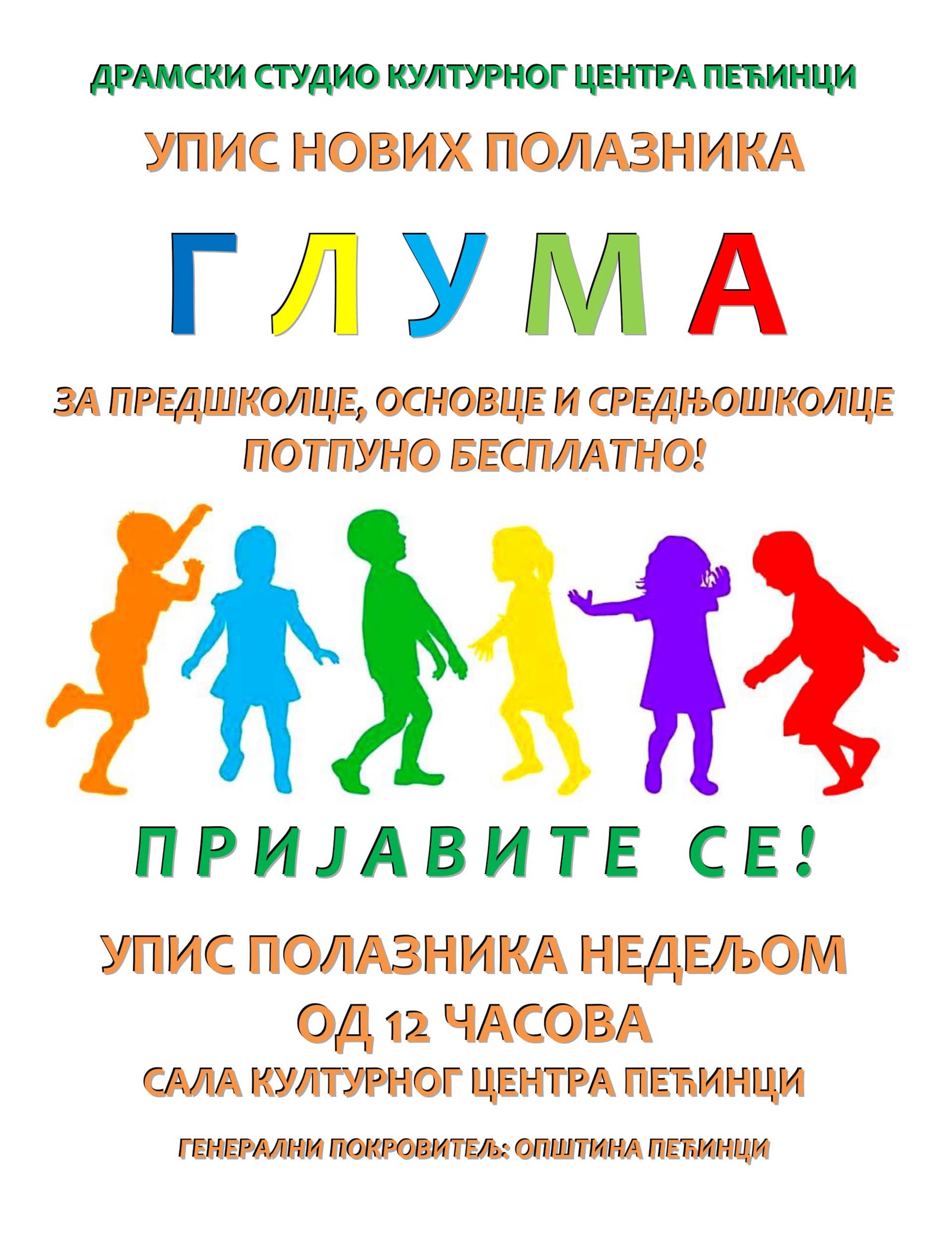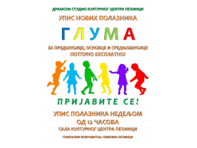 Pećinački Kulturni centar poziva decu predškolskog uzrasta i učenike osnovnoškolskog i srednjoškolskog uzrasta iz svih 15 naselja opštine da se priključe radu Dramskog studija koji funkcioniše u okviru ove ustanove, a čiji rad finansira pećinačka lokalna samouprava.