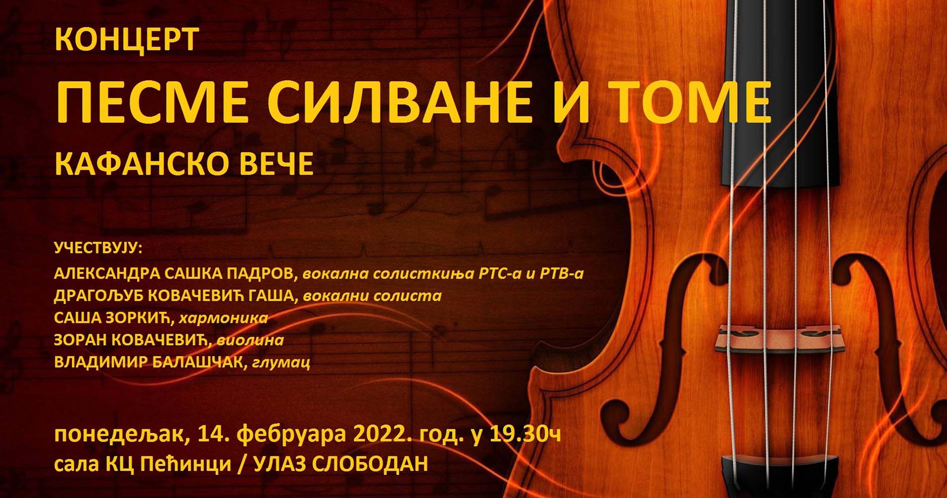 Koncert narodne muzike pod nazivom „Pesme Silvane i Tome – Kafansko veče“ održaće se u ponedeljak 14. februara u sali Kulturnog centra Pećinci sa početkom u 19.30 časova. Organizator koncerta je pećinački Kulturni centar, a generalni pokrovitelj pećinačka lokalna samouprava.