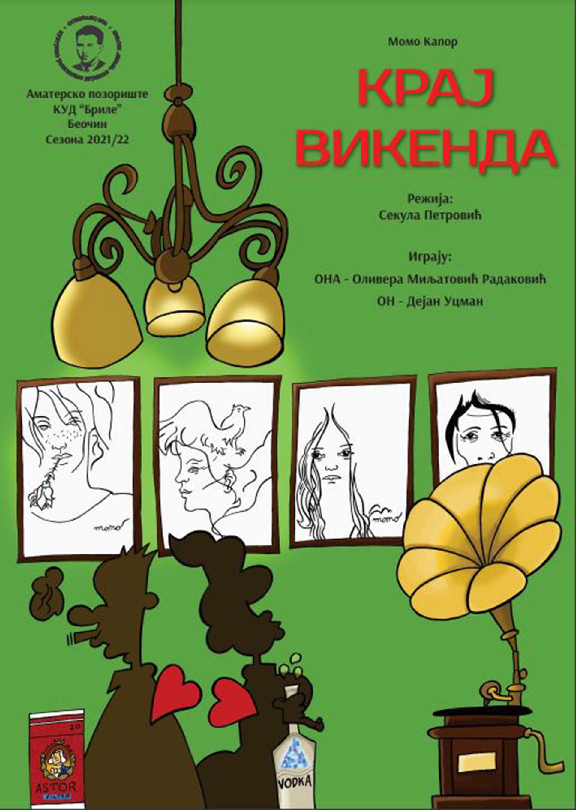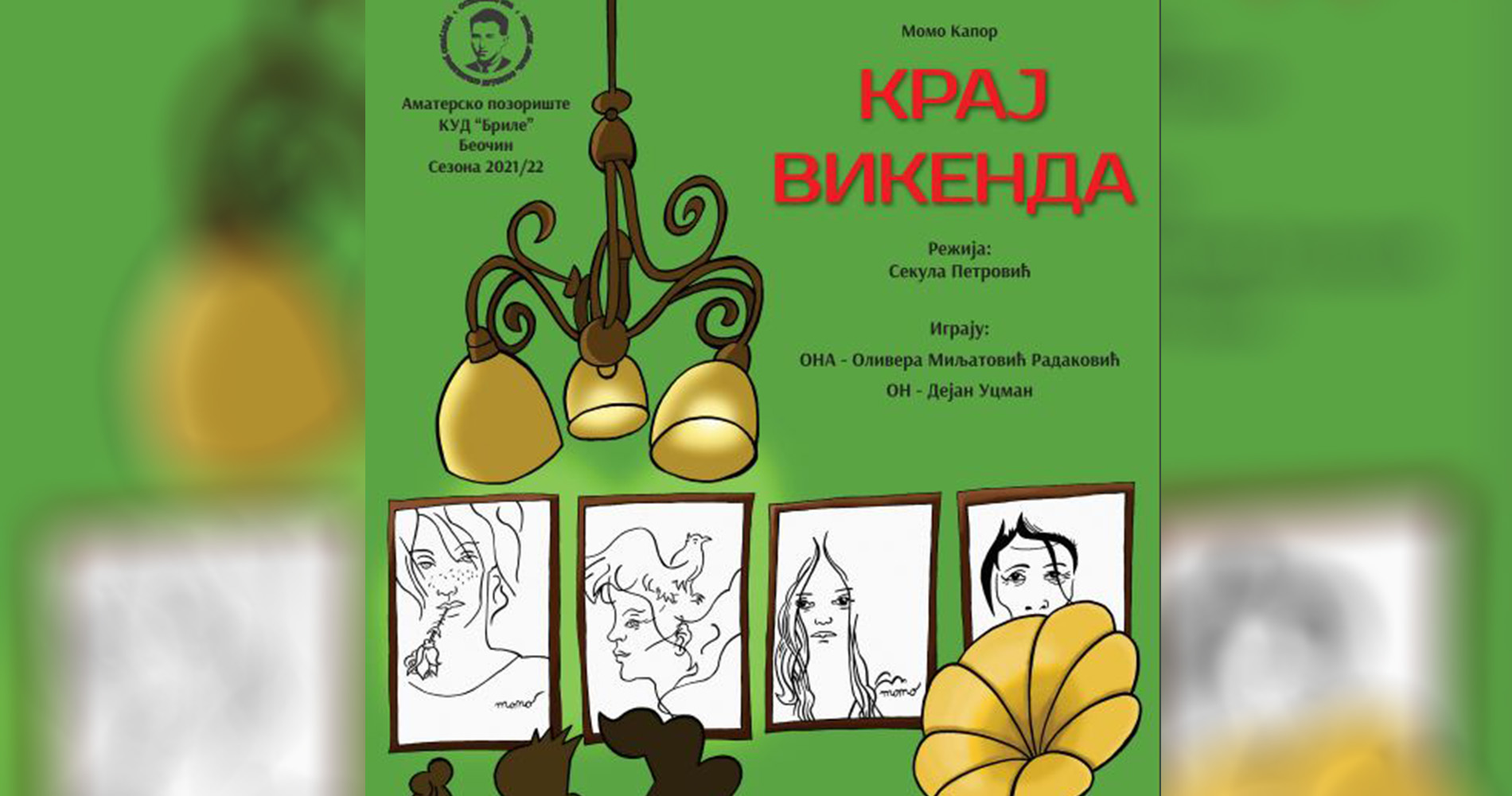 Pozorišna predstava pod nazivom „Kraj vikenda“ rađena po tekstu Mome Kapora u režiji Sekule Petrovića biće izvedena pred pećinačkom publikom u sredu, 16. marta, u sali Kulturnog centra Pećinci sa početkom u 20.00 časova. Ulaz za sve ljubitelje pozorišta je slobodan.