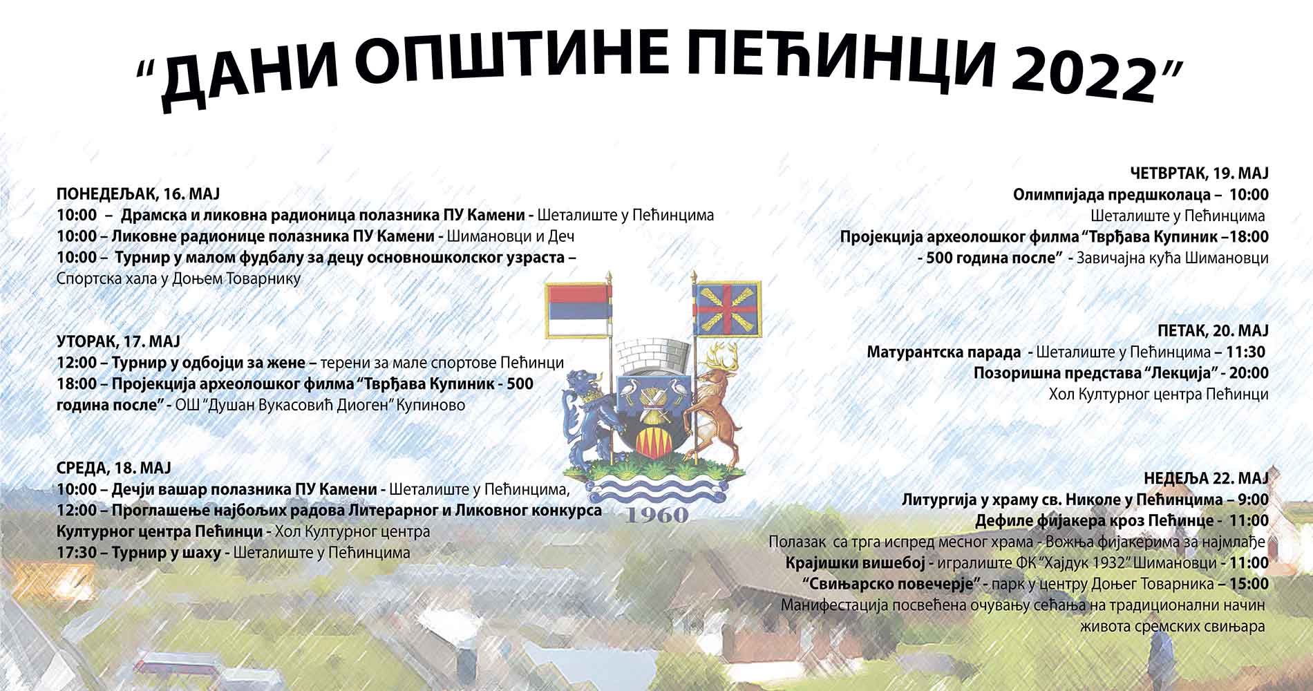 - 11.00 časova, Krajiški višeboj - tereni FK „Hajduk 1932“ u Šimanovcima, u organizaciji Udruženje krajišnika zapadno od Drine, opštinski odbor Pećinci