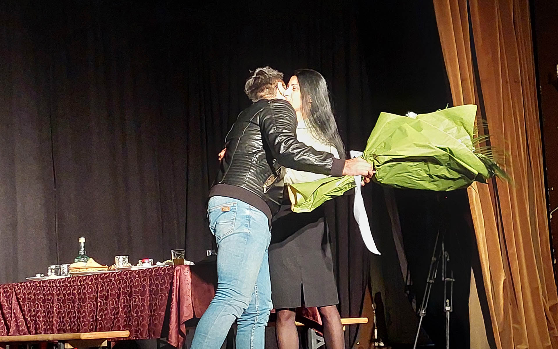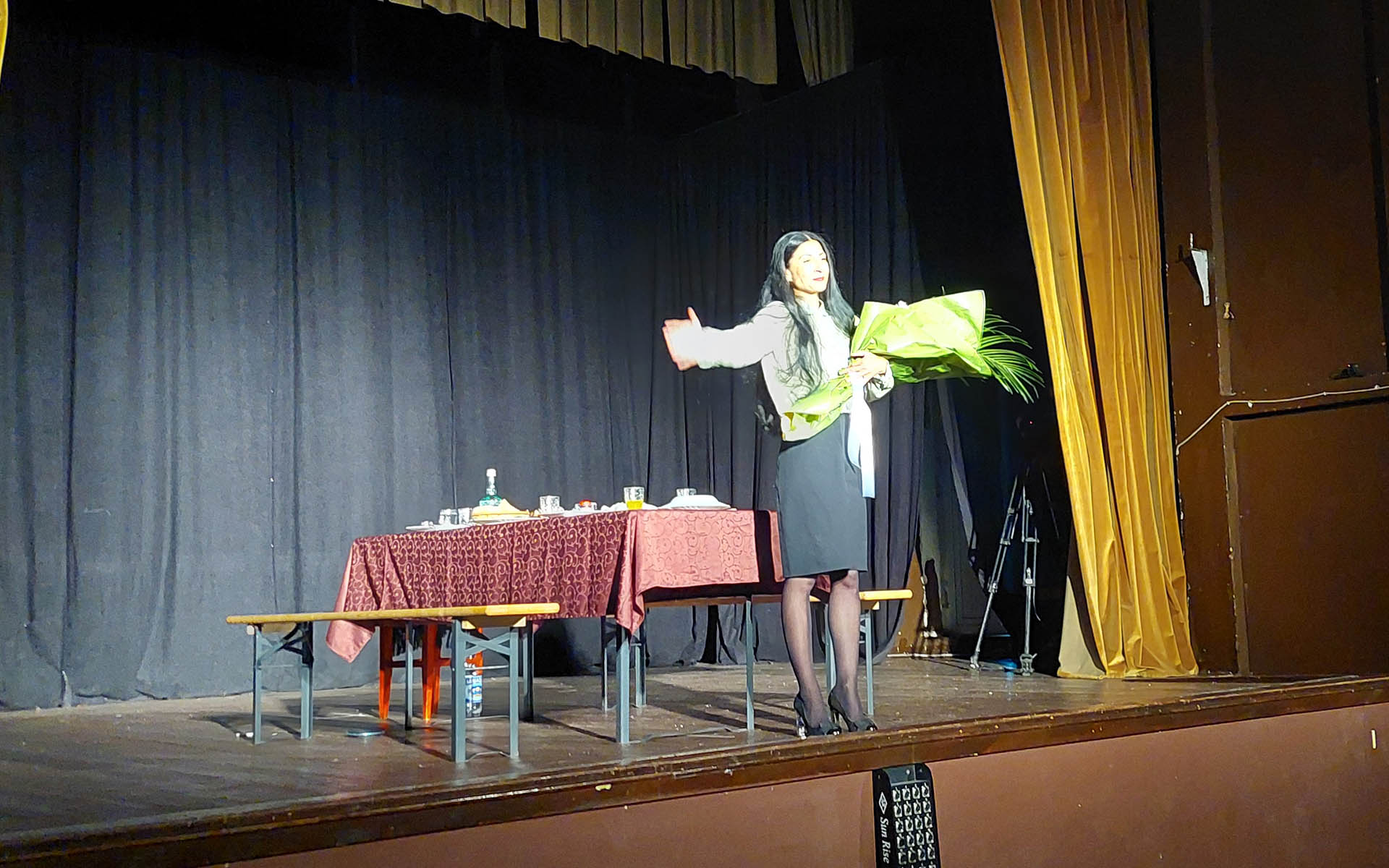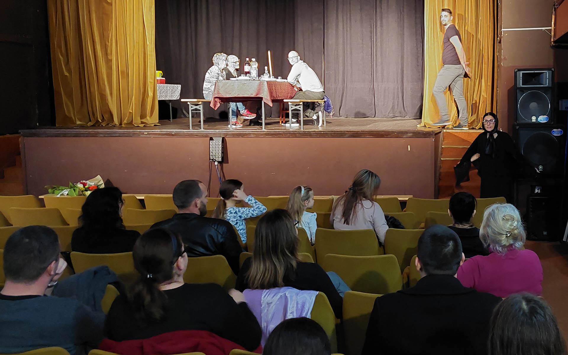 “Prošlo je godinu dana od kako je Kosana sahranila poslednjeg muža, pa smo tako na samom ulazu u Kulturni centar mogli videti partu sa imenom poslednjeg Kosaninog upokojenog muža, hol je bio dvorište kuće u kojem je publika mogla da se posluži kafom „za pokojnikovu dušu“, na ulazu sale publika je oprala ruke u lavoru, kako to i nalaže običaj kada se dođe sa groblja, a sama predstava je otpočela molitvom pre ručka na kojem je prisustvovalo nekoliko gledalaca iz publike u ulogama pokojnikovih poznanika” – rekao nam je Stanković, i dodao da je zadovoljan odzivom i reakcijom publike, kako na samom početku u holu KC, tako i tokom same predstave.