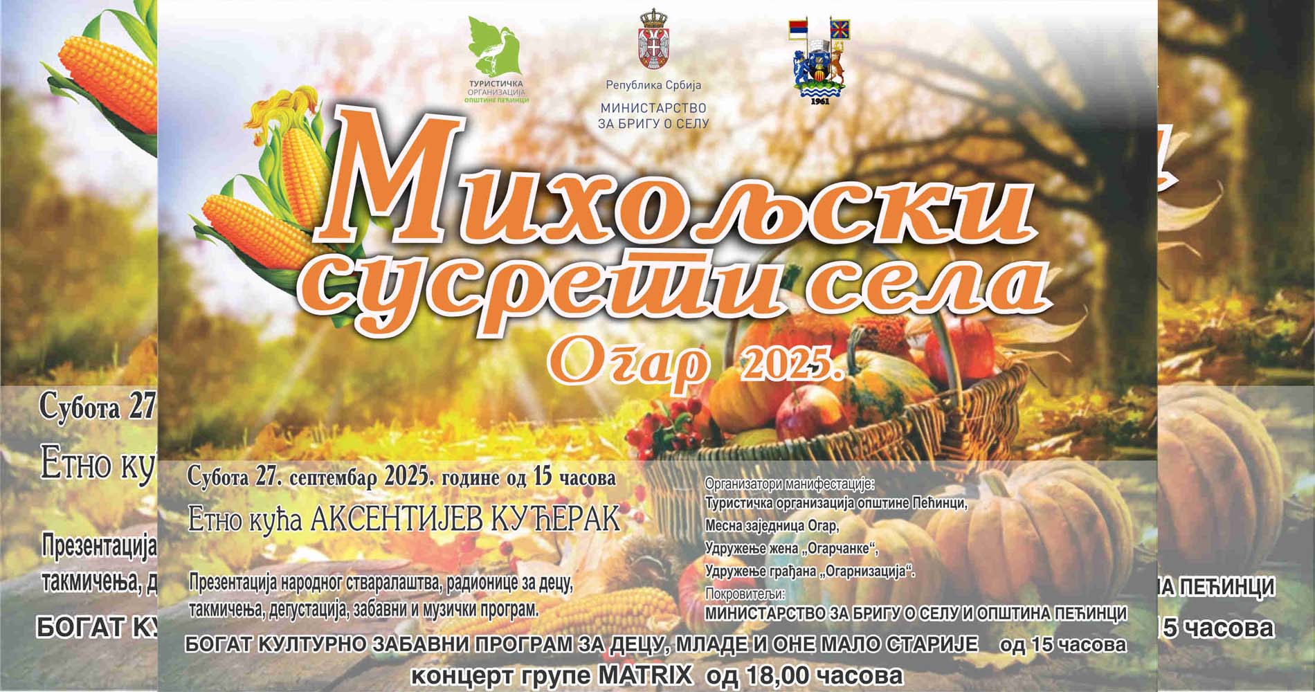 U dvorištu Aksentijevog kućerka u Ogaru Sremci će još jednom odati počast poljoprivrednoj kulturi koja ima kultni status u ovom kraju – kukuruzu, u okviru manifestacije „Miholjski susreti sela“, koju organizuje Turistička organizacija opštine Pećinci, pod pokroviteljstvom Ministarstva za brigu o selu i Opštine Pećinci.