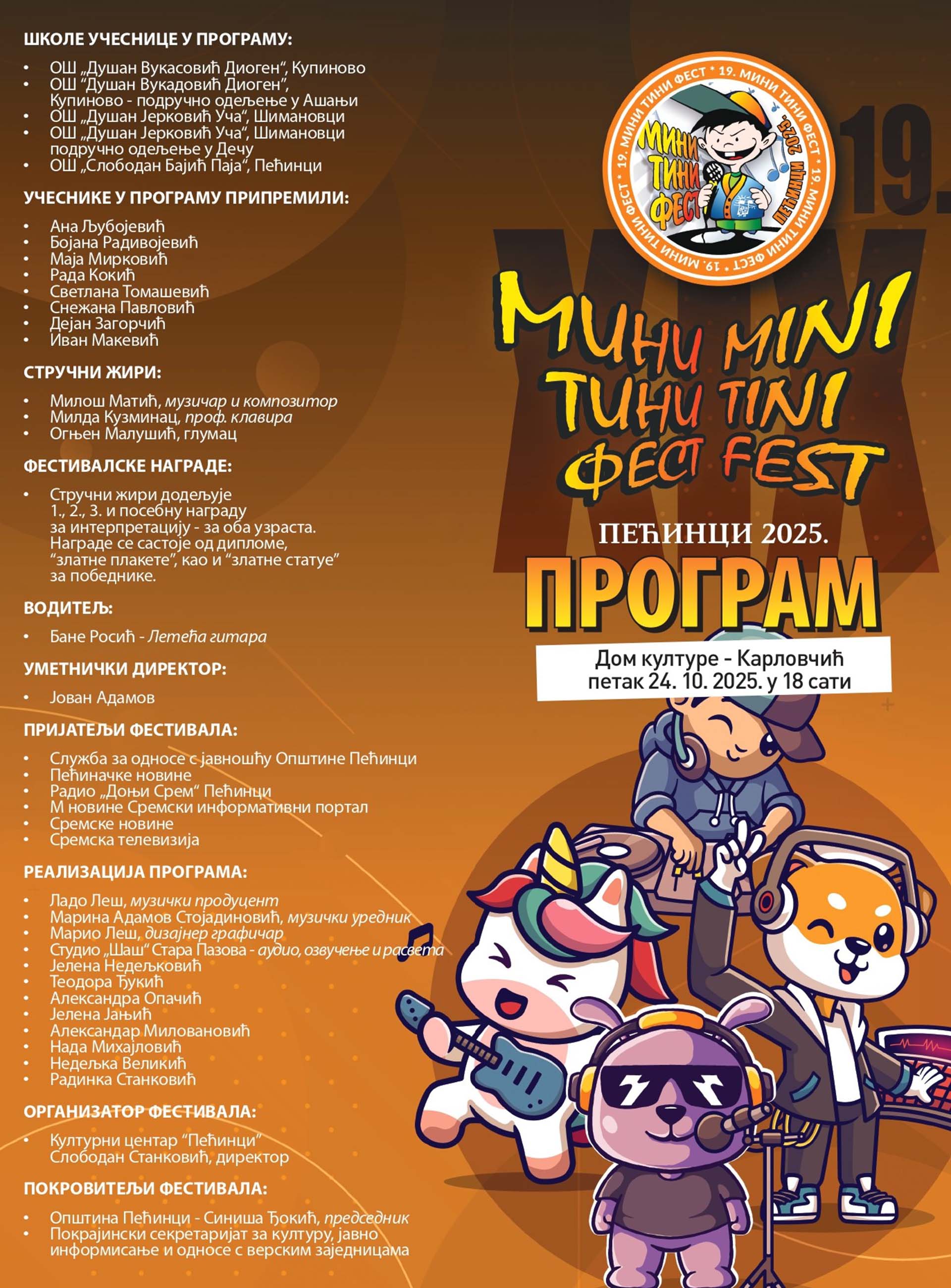 Dečji muzički festival „Mini-tini fest“, koji se ove godine održava 19. put pod sloganom „Deca će pobediti“, održaće se u petak, 24. oktobra, sa početkom u 18.00 časova, u sali Doma kulture u Karlovčiću.