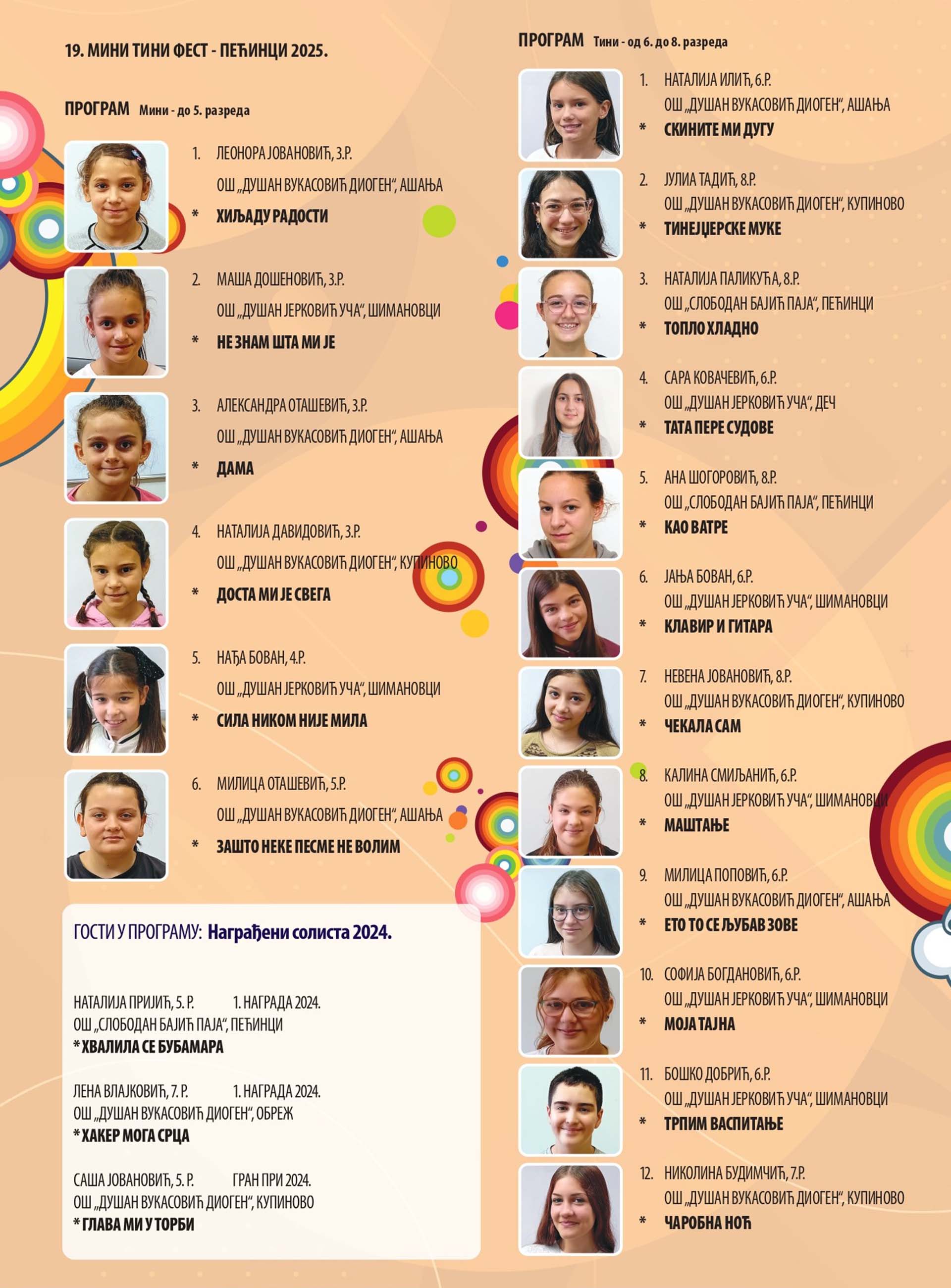Nakon tronedeljnih audicija u školama širom pećinačke opštine, koje bile održane tokom septembra i početkom oktobra, u finale festivala plasiralo se 18 mladih vokalnih talenata. U kategoriji „mini“ (1-5 razred) nastupiće: Nađa Bovan (Šimanovci), Natalija Davidović (Kupinovo), Maša Došenović (Šimanovci), Leonora Jovanović (Ašanja), Aleksandra Otašević (Ašanja) i Milica Otašević (Ašanja). U kategoriji „tini“ (6-8 razred) nastupiće: Janja Bovan (Šimanovci), Sofija Bogdanović (Šimanovci), Nikolina Budimčić (Kupinovo), Boško Dobrić (Šimanovci), Natalija Ilić (Ašanja), Nevena Jovanović (Kupinovo), Sara Kovačević (Deč), Natalija Palikuća (Pećinci), Milica Popović (Ašanja), Kalina Smiljanić (Šimanovci), Julija Tadić (Kupinovo) i Ana Šogorović (Pećinci).