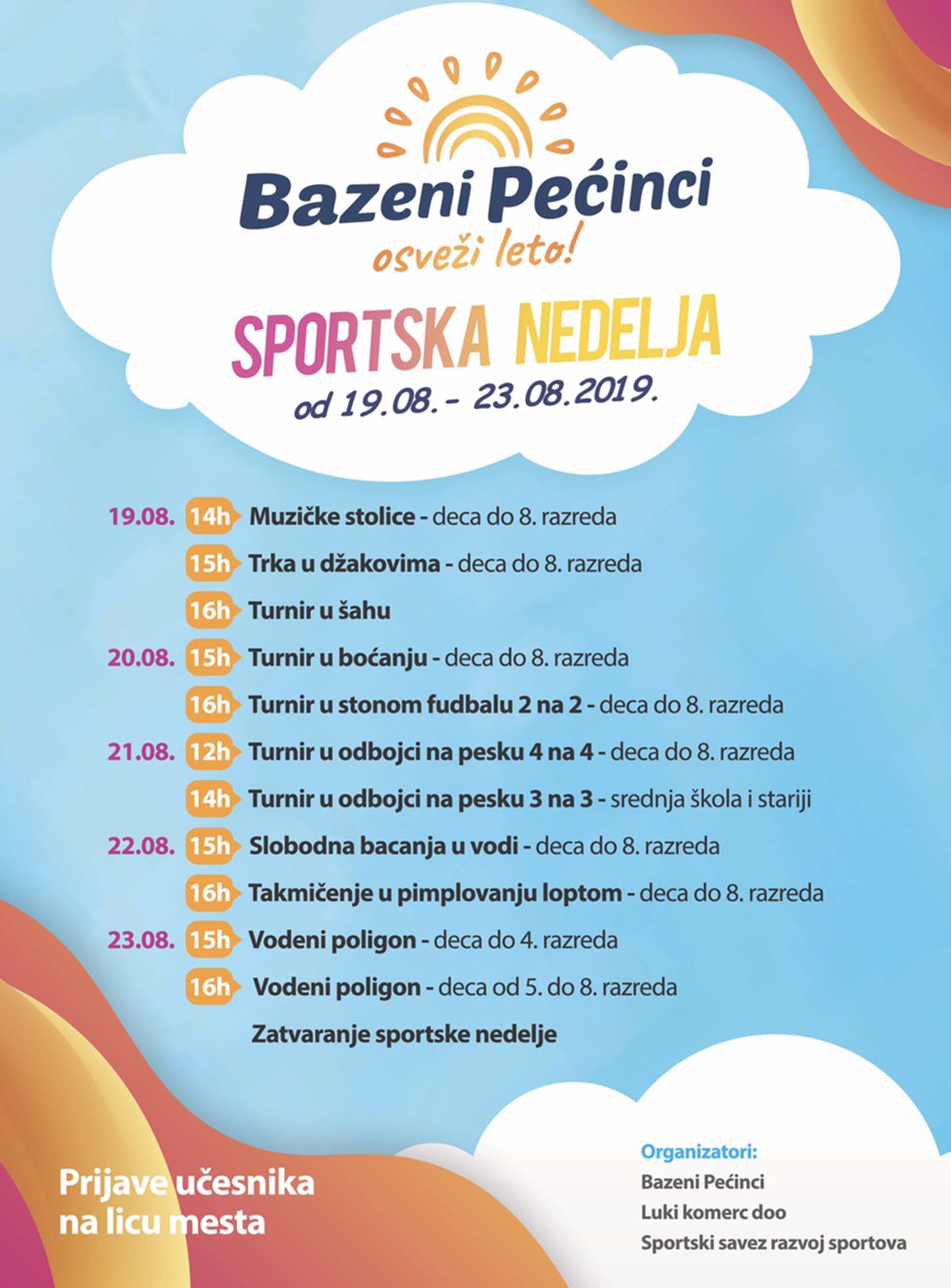 Базени Пећинци, у сарадњи са Спортским савезом „Развој спортова“ организују Спортску недељу од 19. до 23. августа. Петодневна Спортска недеља биће испуњена најразличитијим спортским надметањима, највише намењеним деци узраста од 1. до 8. разреда основне школе, али ће у такмичењима током Спортске недеље моћи да се пронађу и средњошколци и старији.