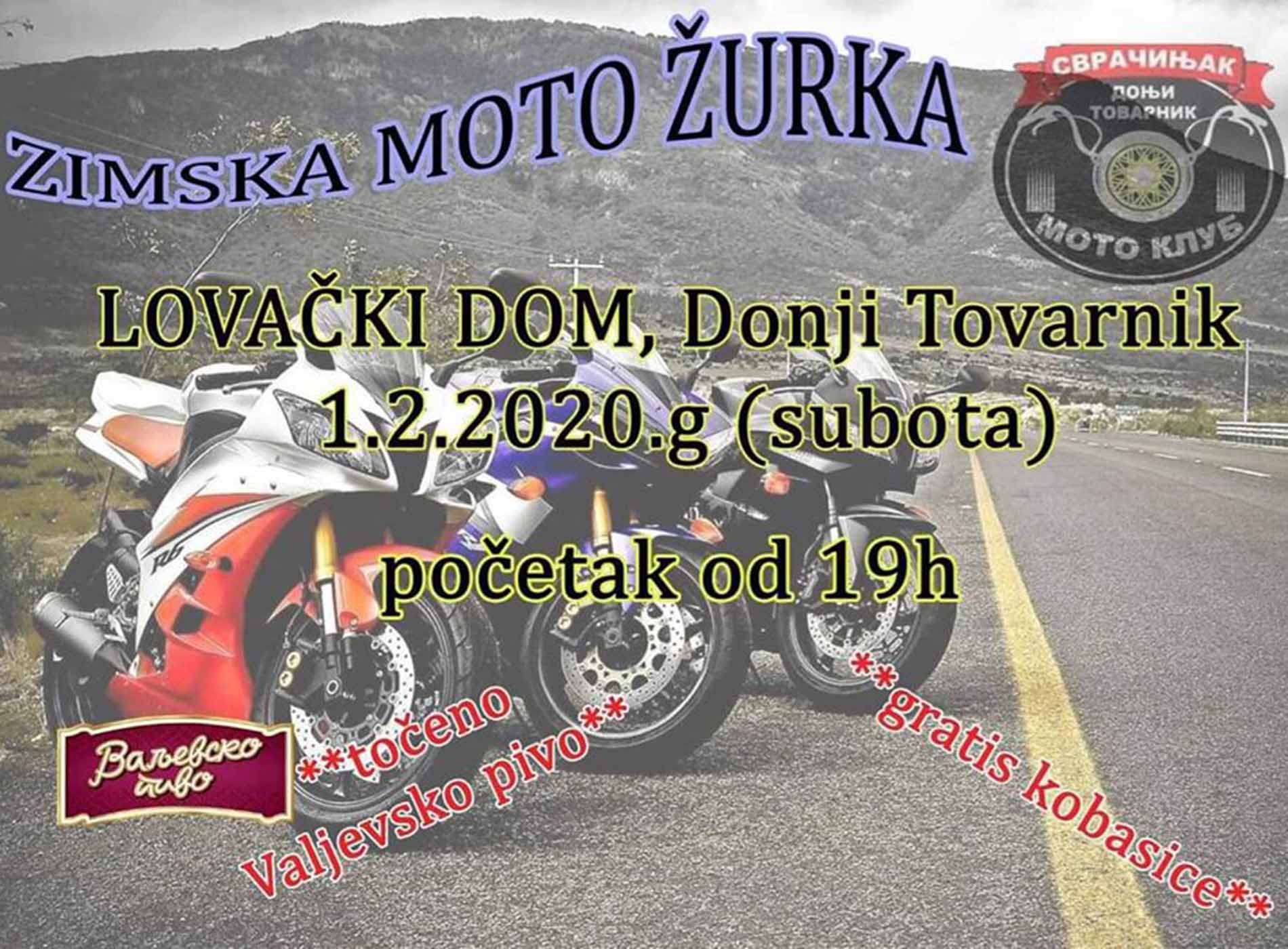 Велика зимска мото журка почиње вечерас, у 19.00 часова, у ловачком дому у Доњем Товарнику. Из Мото клуба „Сврачињак“, који је организатор скупа, најављују одличан провод уз живи наступ „Рајсфершлус бенда“. Улаз је слободан, а организатори су за све посетиоце обезбедили бесплатну храну и пиће.
