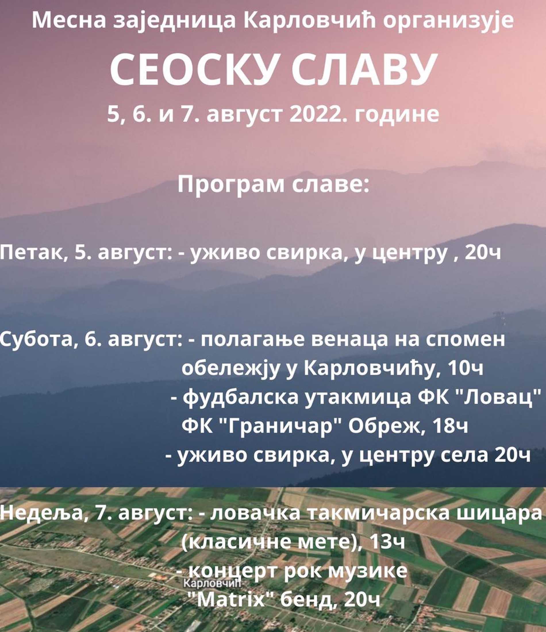 У недељу, 7. августа, у 13.00 часова, биће организована ловачка такмичарска шицара (класичне мете), док је за 20.00 часова заказан концерт рок музике Матрикс бенда.