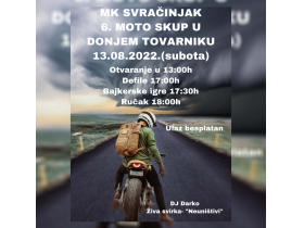 Мото клуб “Сврачињак” организује у суботу, 13. јула, мото скуп у Доњем Товарнику. Отварање је у 13.00 часова, а од 17.00 часова је дефиле учесника скупа улицама Доњег Товарника. У 17.30 часова почињу бајкерске игре, а ручак је заказан у 18.00 часова.