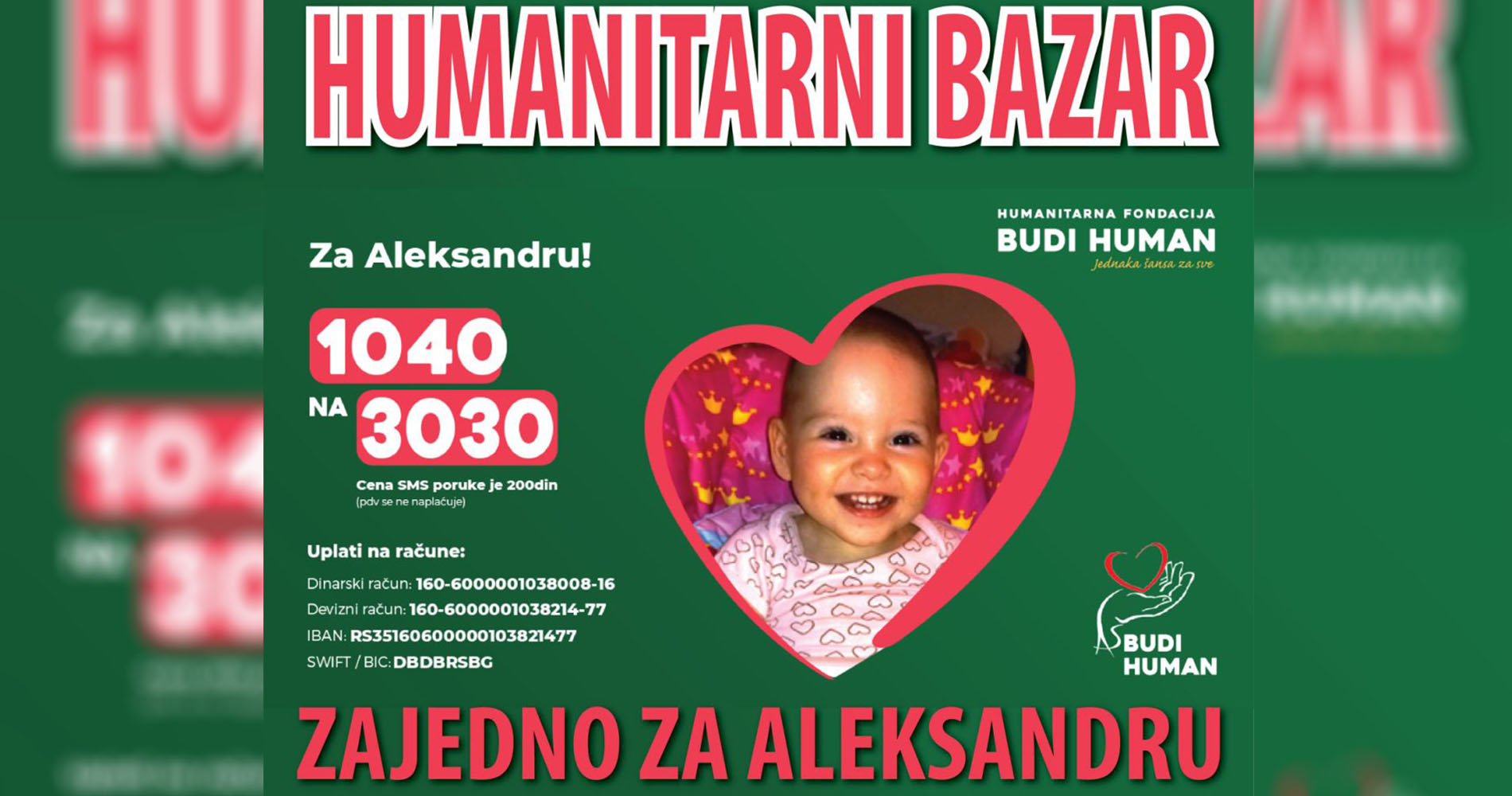 Чланице пећиначког Кола спрских сестара позивају грађане да дођу на базар или да пошаљу СМС садржине 1040 на број 3030 или да оставе новчани прилог у донаторску кутију која ће бити изложена на базару, а како кажу потребно је да се до 4. септембра прикупи још 7000 евра, како би Александра отпутовала у Америку на операцију.