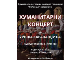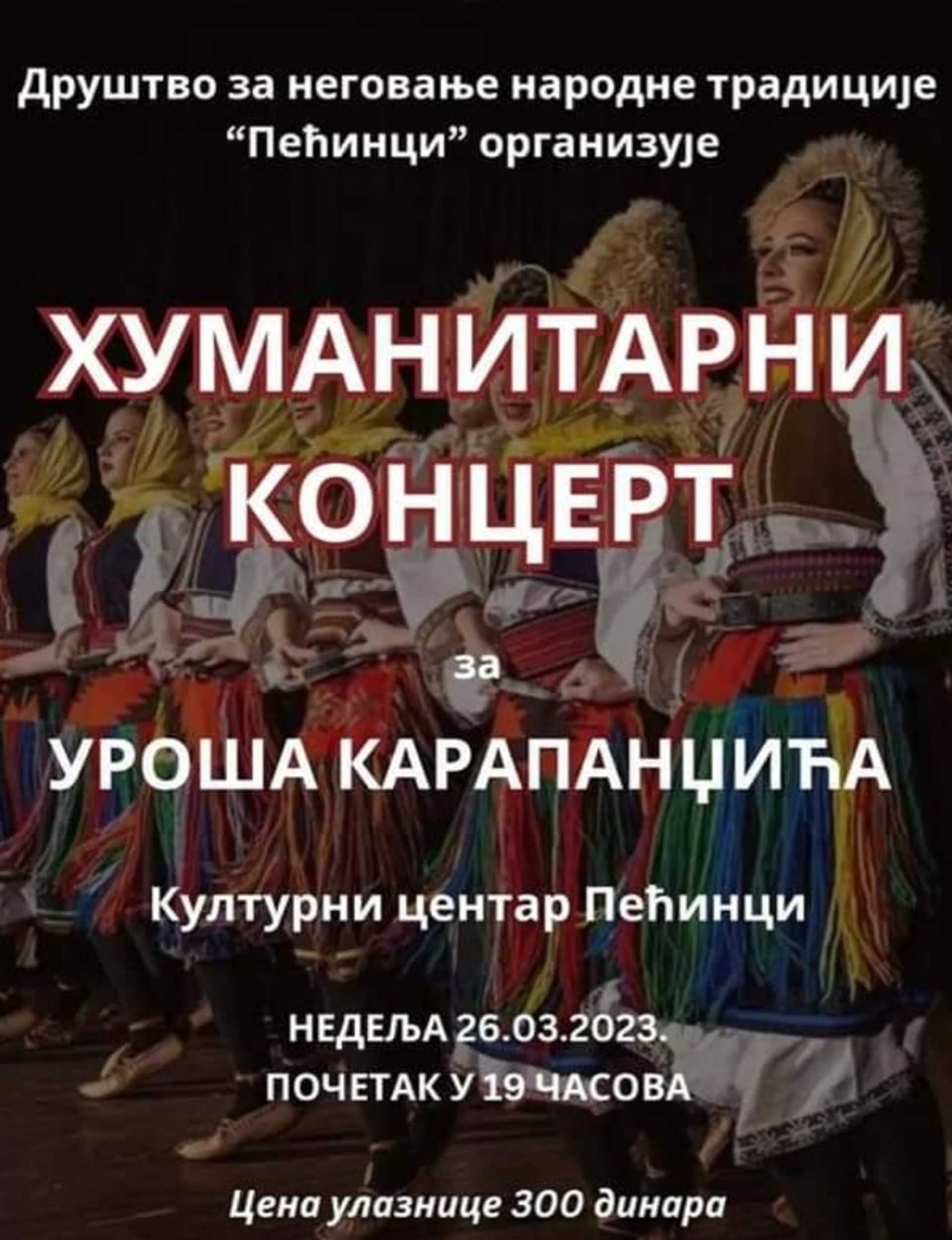 У пећиначком Културном центру, у недељу 26. марта, Друштво за неговање народне традиције “Пећинци” одржаће хуманитарни концерт за Уроша Карапанџића, током којег ће наступити сви чланови пећиначког друштва, као и гости из Шимановаца ДННТ “Искон” и из Добановаца КУД “Будућност 1984”. Техничку подршку пружиће КЦ, а цена улазнице је 300 динара.