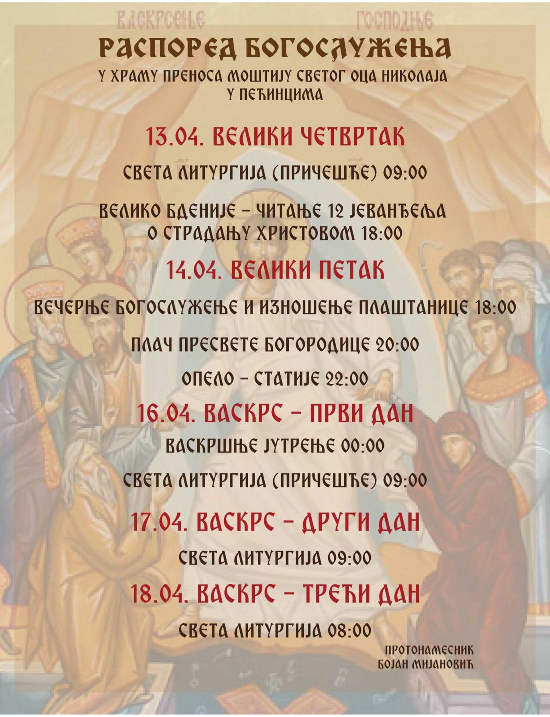 Светосавска омладинска заједница (СОЗ) и Коло српских сестара при Архијерејском намесништву пећиначком организује четвородневни Ускршњи базар на пећиначком тргу. Базар ће бити хуманитарно-продајног карактера, а биће изложени манастирски производи, као и производи локалних произвођача, украшена јаја, домаћи сапуни, колачи и декоративни предмети.