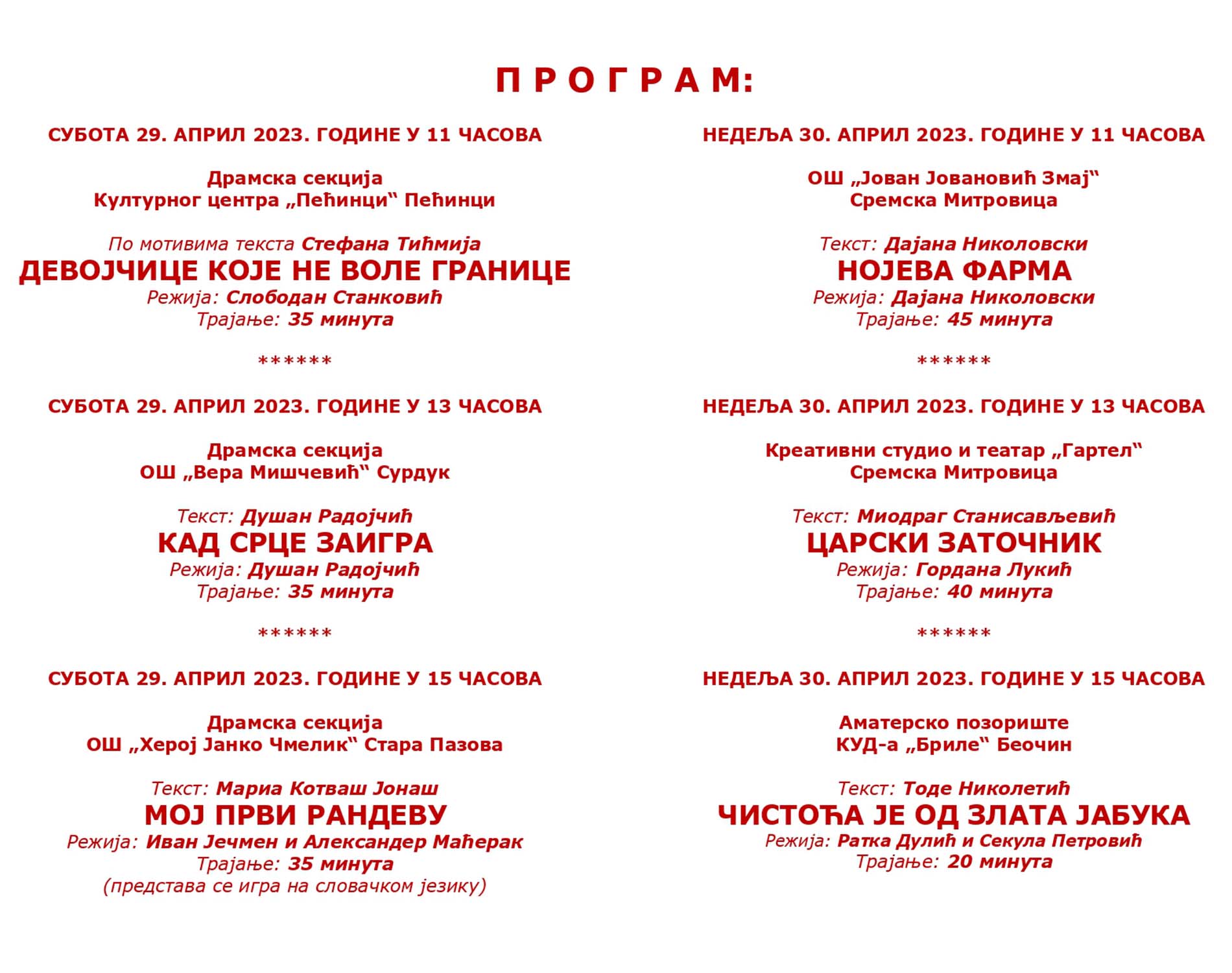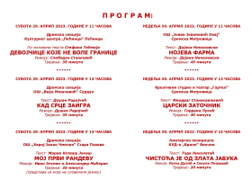 Смотра ће бити отворена представом домаћина „Девојчице које не воле границе“ у извођењу чланова Драмске секције пећиначког Културног центра, у суботу, 29. априла, у 11.00 часова, а истог дана од 13.00 часова наступиће чланови Драмске секције Основне школе „Вера Мишчевић“ из Сурдука са представом „Кад срце заигра“, док ће од 15.00 часова бити изведена представа под називом „Мој први рандеву“, коју ће одиграти чланови Драмске секције Основне школе „Херој Јанко Чмелик“ из Старе Пазове.