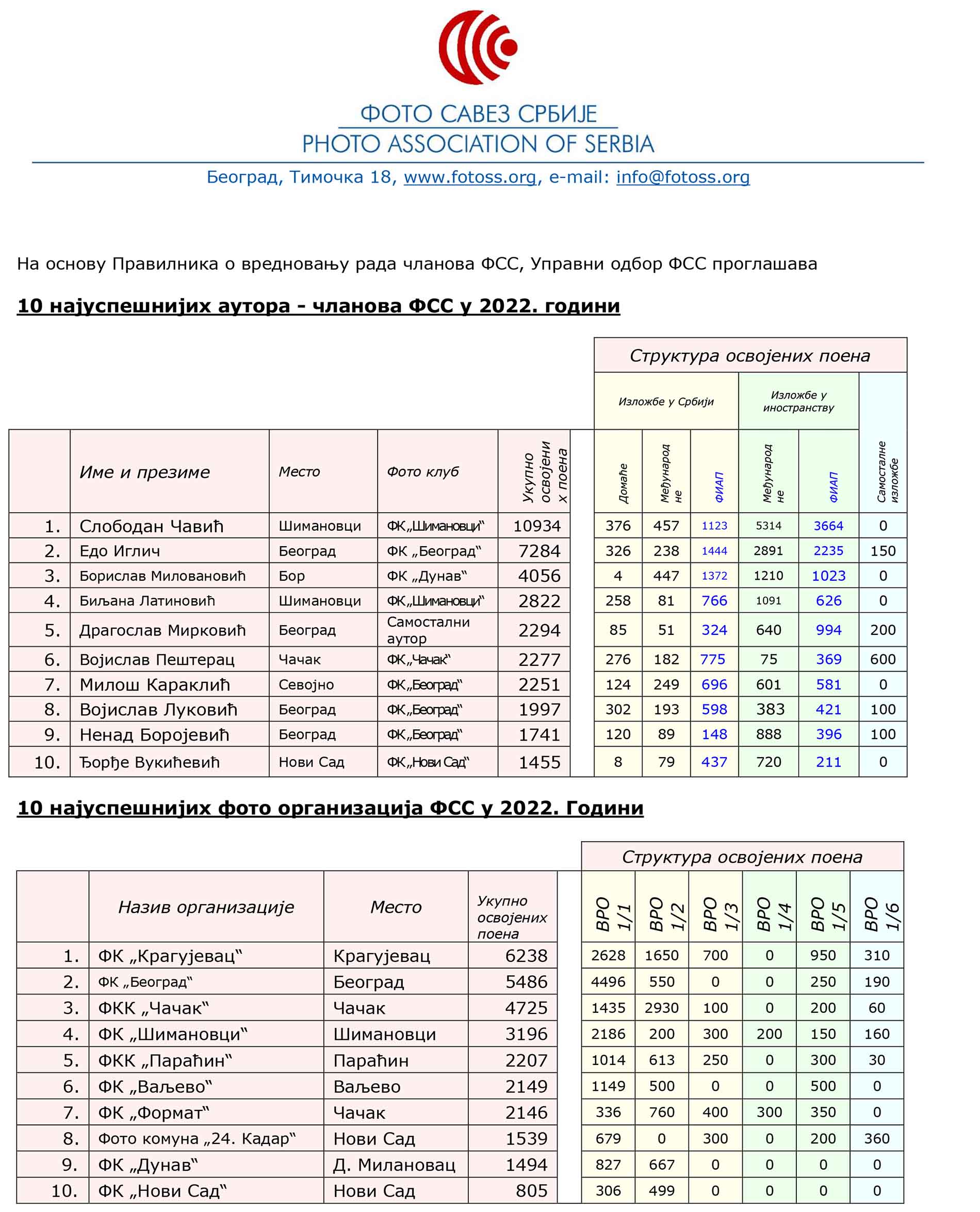 Фото савез Србије објавио је листу 10 најуспешнијих фотографа и фото организација у 2022. години, а први на листи аутора је уметнички фотограф из Шимановаца Слободан Чавић. Чавић се за титулу најуспешнијег српског фотографа за прошлу годину изборио учешћем на преко 200 међународних и домаћих изложби, на којима је за своје радове освојио преко 200 медаља и око 300 похвала.