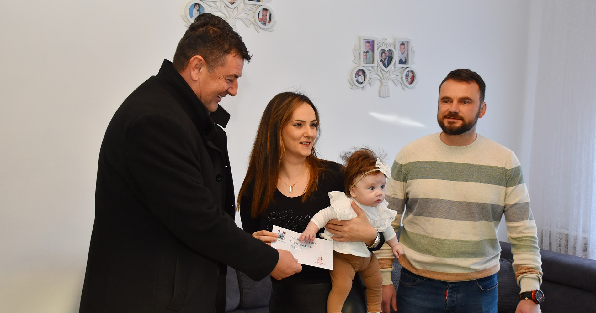 Председник општине Пећинци Синиша Ђокић уручио је данас једнократну новчану накнаду за новорођенче, у износу од 40.000 динара, породици Гмизић из Пећинаца. Реч је о мери популационе политике коју пећиначка локална самоуправа спроводи дуже од 10 година.