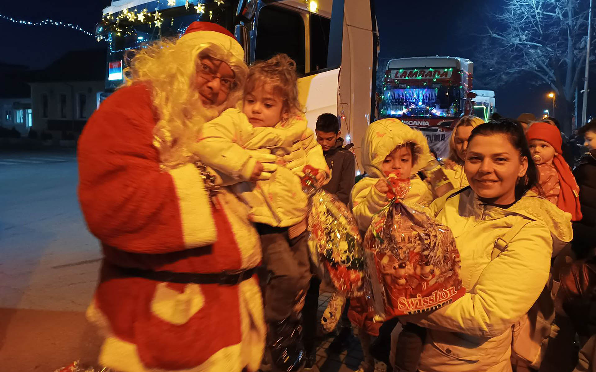 Четири камиона окићена новогодишњим украсима, заједно Шофером Мразом и Шофером Мразицом, прошао је синоћ и кроз општину Пећинци. Конвој са срцем, који организује Удружење Друг са друма – Возачи са срцем, реализује се већ пар година, а током вожње кроз нашу земљу и дијаспору поделе пакетиће деци породица настрадалих колега и деци са сметњама у развоју и без родитељског старања.