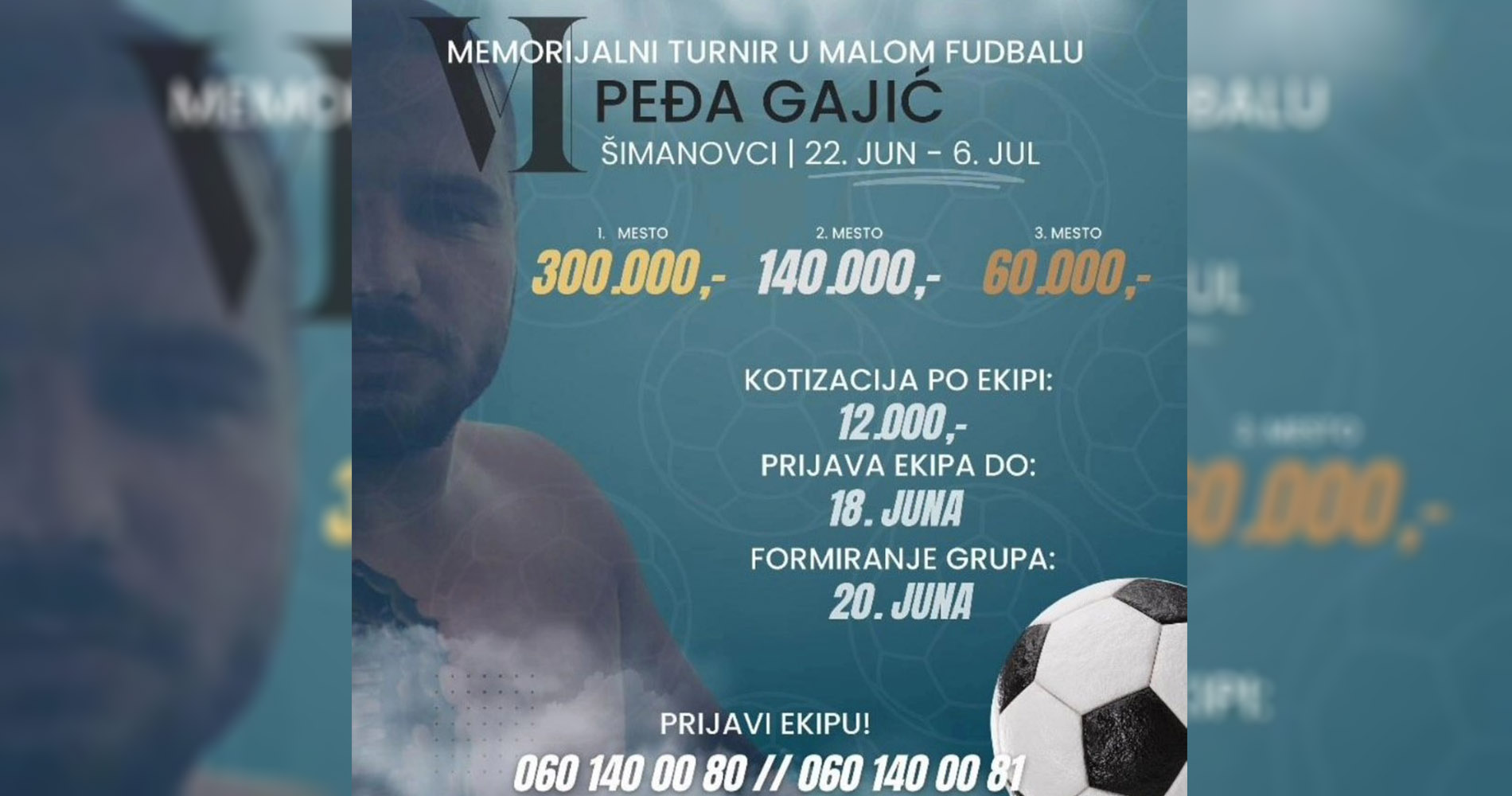 Шести Меморијални турнир у малом фудбалу „Пеђа Гајић“ биће одржан у Шимановцима, у периоду од 22. јуна до 6. јула. Како су најавили организатори турнира и ове године прикупљена средства током трајања турнира биће уплаћена у хуманитарне сврхе, а обезбеђене су и вредне новчане награде за победнике.