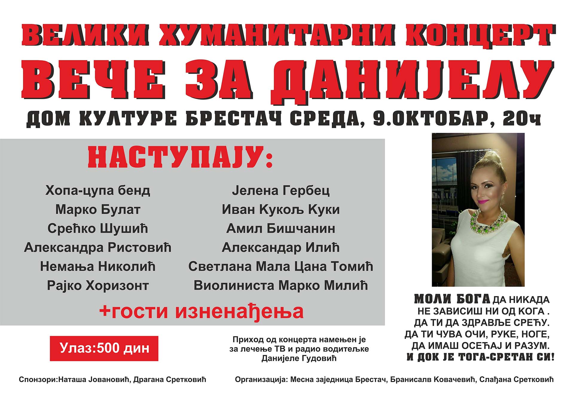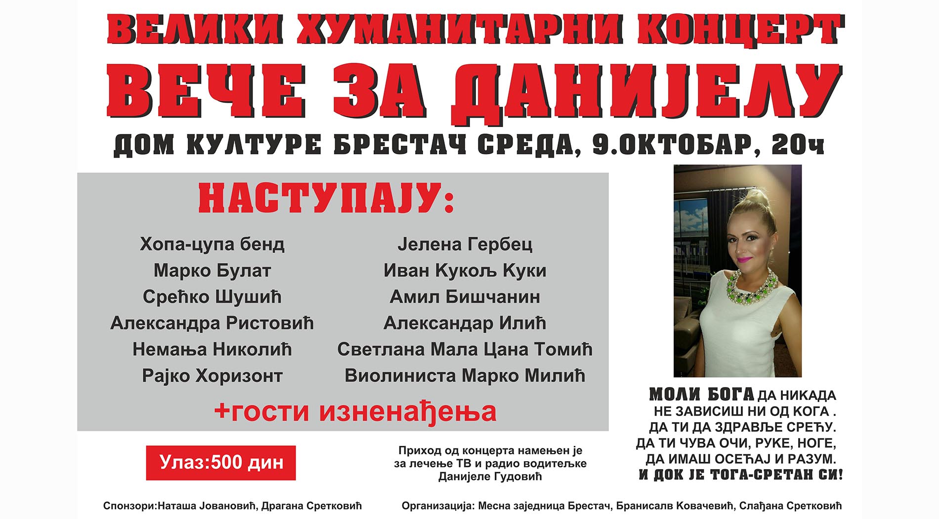 Сутра велики хуманитарни концерт Вече за Данијелу