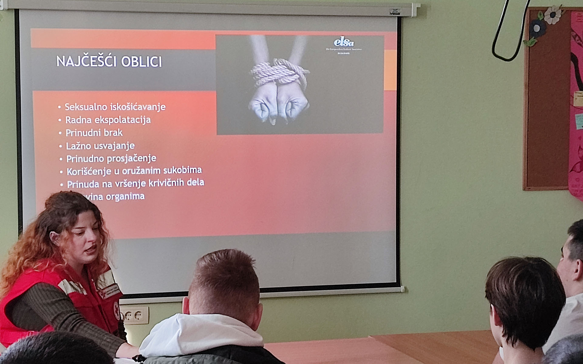 Волонтер Црвеног крста Милица Николић, обрадила је основне теме из ове области као што је, пре свега, препознавање трговине људима, али и како допринети борби уз неколико начина - информисање заједнице, превенција кроз едукацију младих и подршка жртвама.