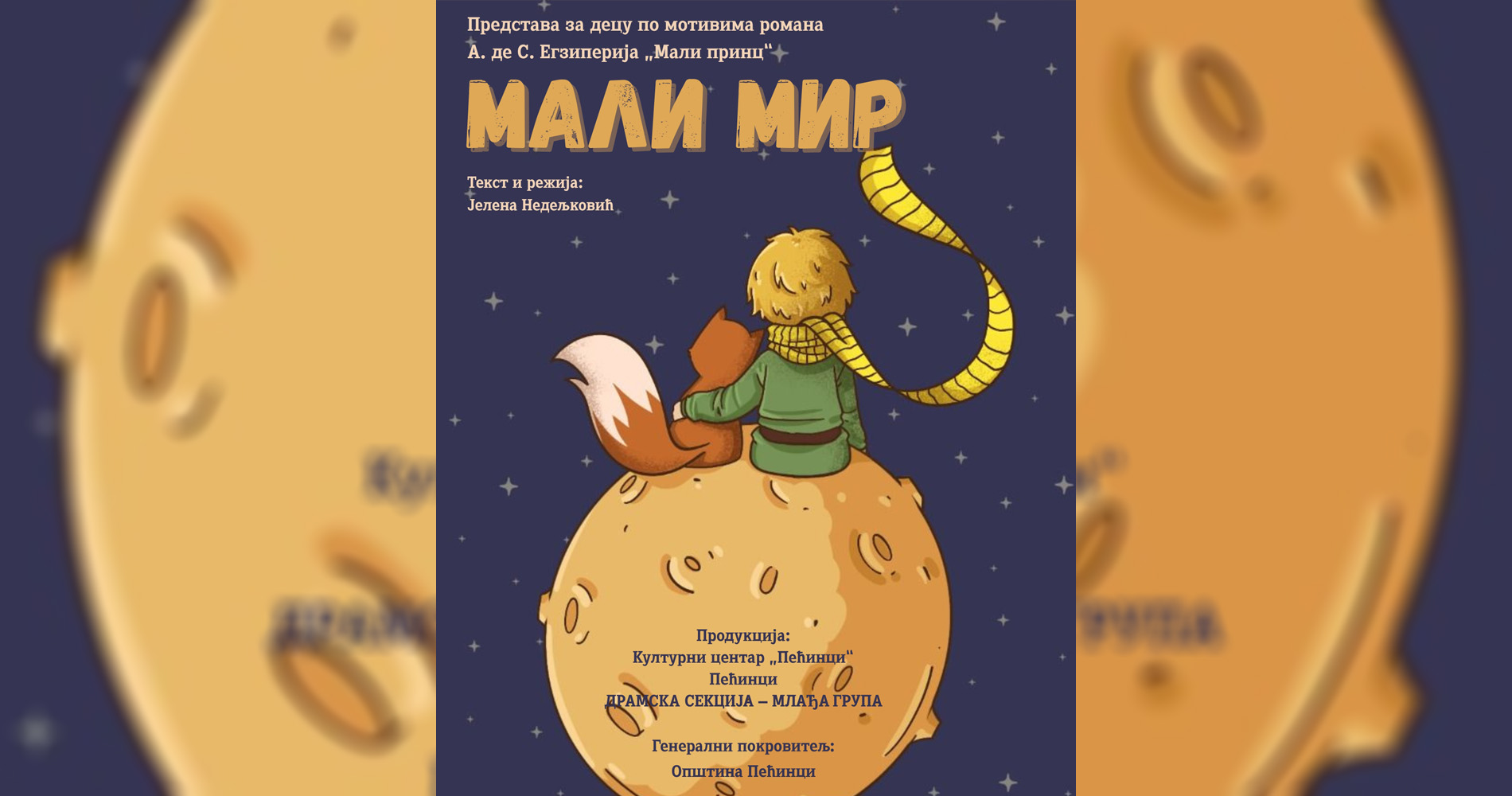 Режију потписује Јелена Недељковић, а улогама и сценском игром представу оживљавају чланови млађе групе Драмске секције Културног центра „Пећинци“. Представа се изводи у оквиру Зонске смотре дечијег сценског стваралаштва Срема и доноси нежну, поетску и дирљиву причу о пријатељству, љубави и важним животним вредностима виђену очима детета.