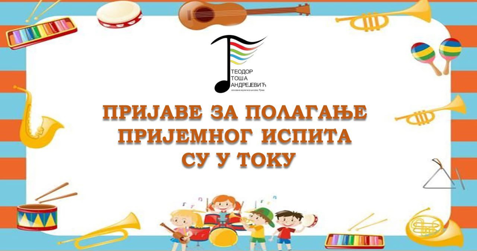 Пријемни је намењен ученицима првих и других разреда основних школа, с тим да се прваци уписују у припремни разред музичке школе, док другаци полазе у први разред музичке школе и започињу свој рад на одабраном инструменту. Сви заинтересовани за полагање пријемног испита претходно је потребно да се јаве матичној школи у Руми на број телефона 022/474042 или лично на адреси ЈНА 140, Рума. Наглашавамо да су доступна слободна места на одсецима гитара, тамбура и хармоника, док на одсек клавира неће бити примања ове године.