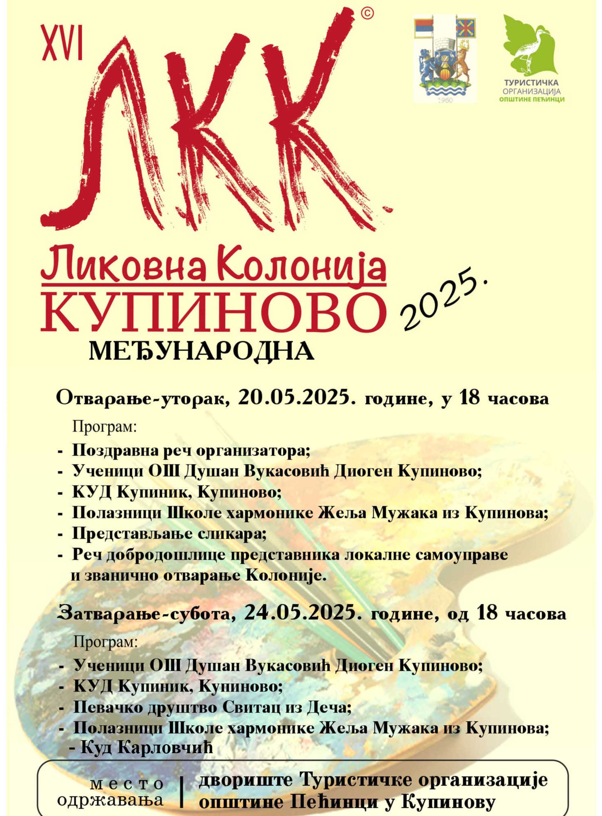 Учесници 16. Колоније представиће се на самом отварању, уз пригодан културно-уметнички програм, а публици ће се обратити и представници Удружења „Колонија Купиново“ и пећиначке локалне самоуправе.