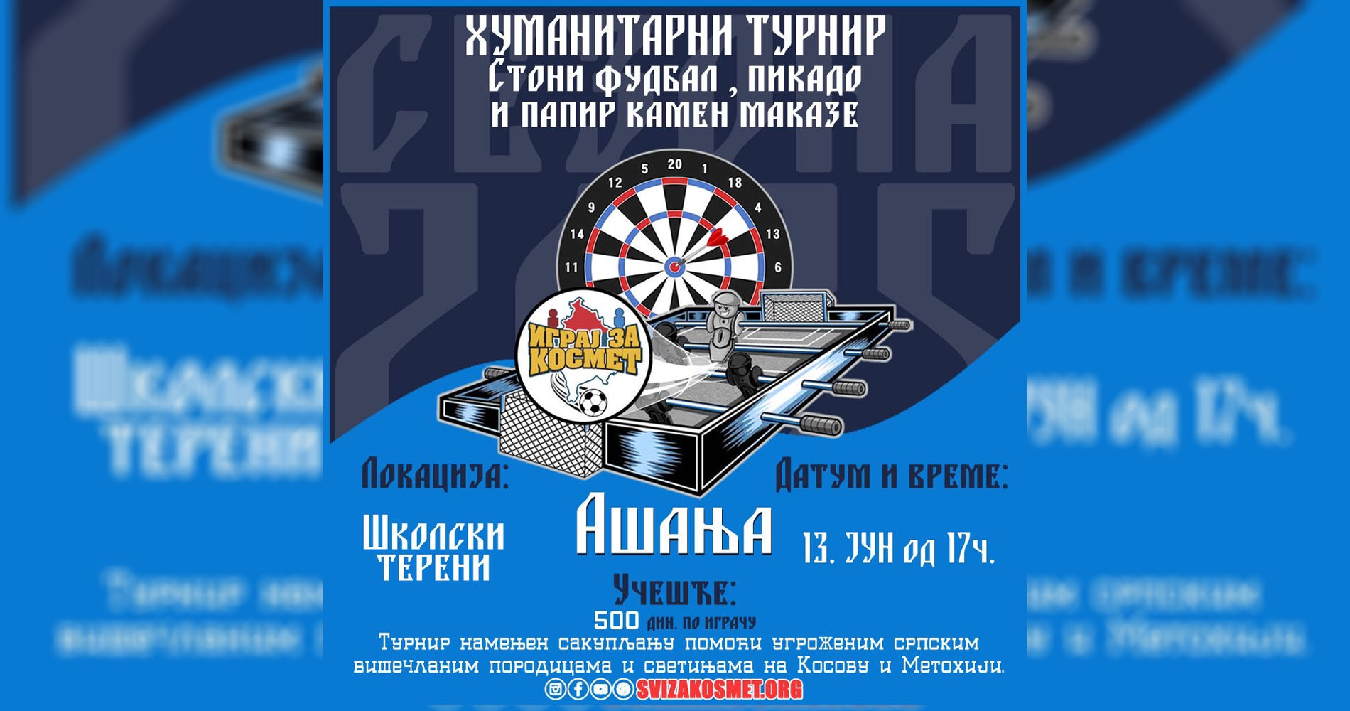 Хуманитарна организација „Сви за Космет“ у сарадњи са Месном заједницом Ашања, организује хуманитарни турнир у стоном фудбалу, пикаду и игри папир, камен, маказе.