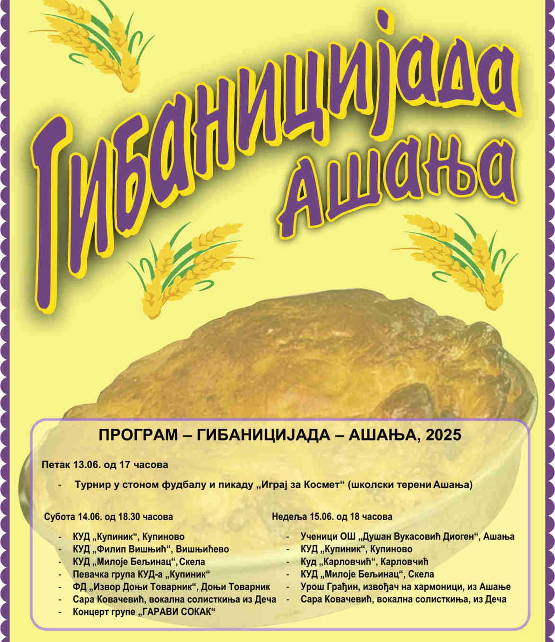 Петнаеста Гибаницијада у Ашањи биће одржана 14. и 15. јуна, а посетиоци ће и ове године моћи да уживају у једном од најпознатијих домаћих специјалитета – гибаници, као и у богатом културно-уметничком програму.