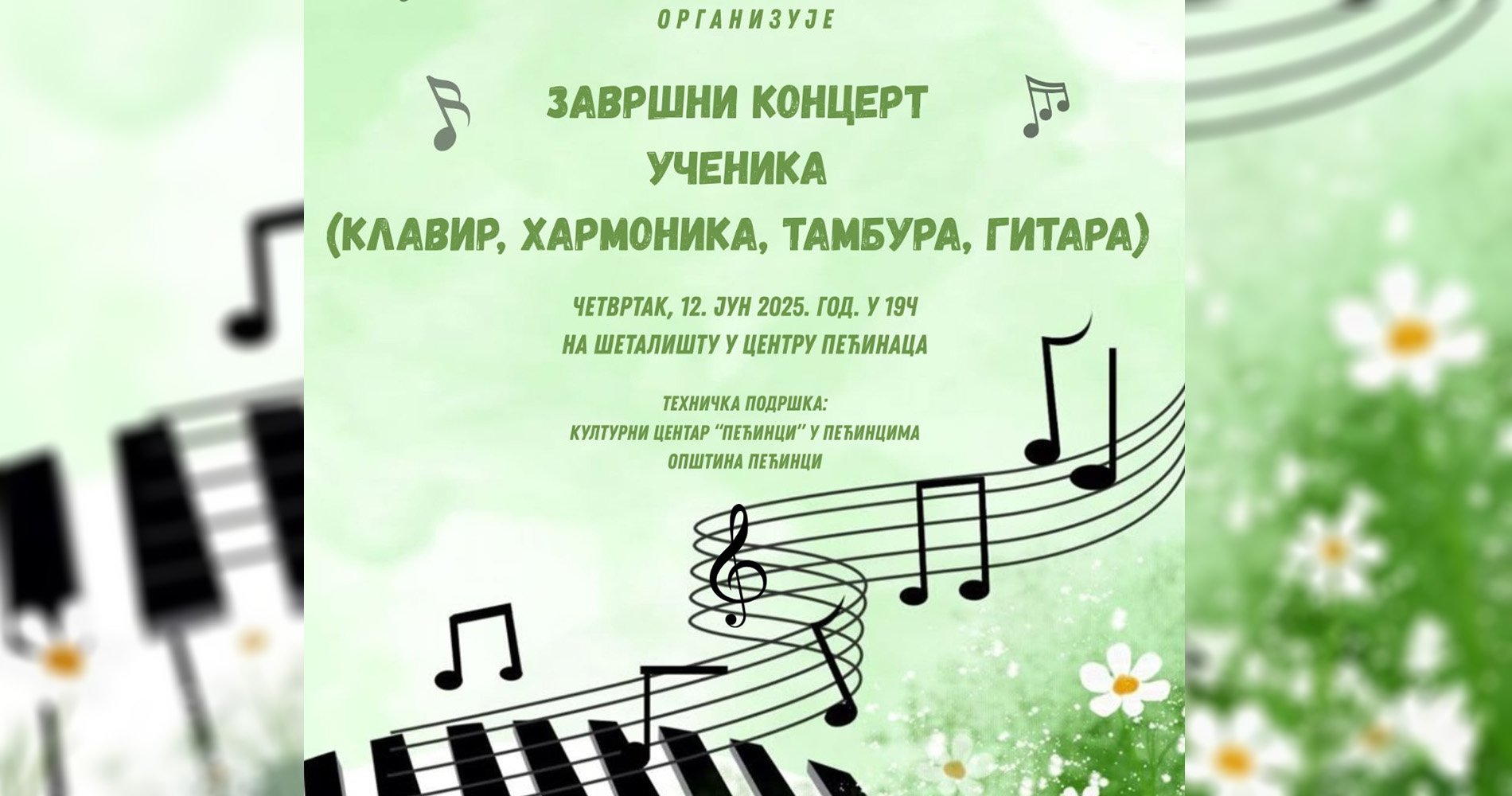 Завршни концерт пећиначког одељења Основне музичке школе,,Теодор Тоша Андрејевић“ из Руме, биће одржан у четвртак, 12. јуна, на шеталишту у Пећинцима.