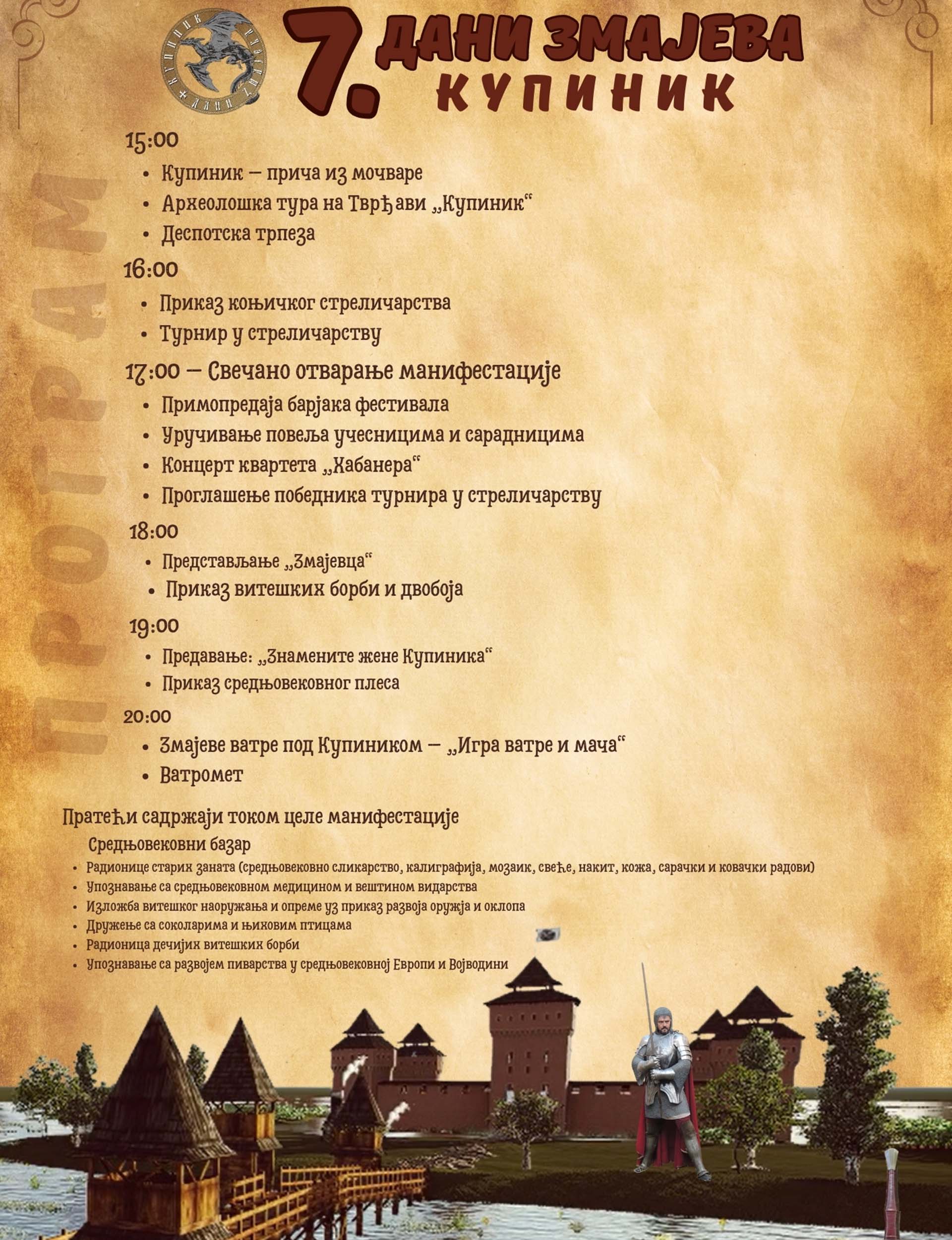 У 18.00 часова биће представљен „Змајевац“ – заветни мач чувара Купиника, након чега ће уследити витешке борбе и двобоји. Од 19.00 часова планирано је предавање „Знамените жене Купиника“ и приказ средњовековних плесова.