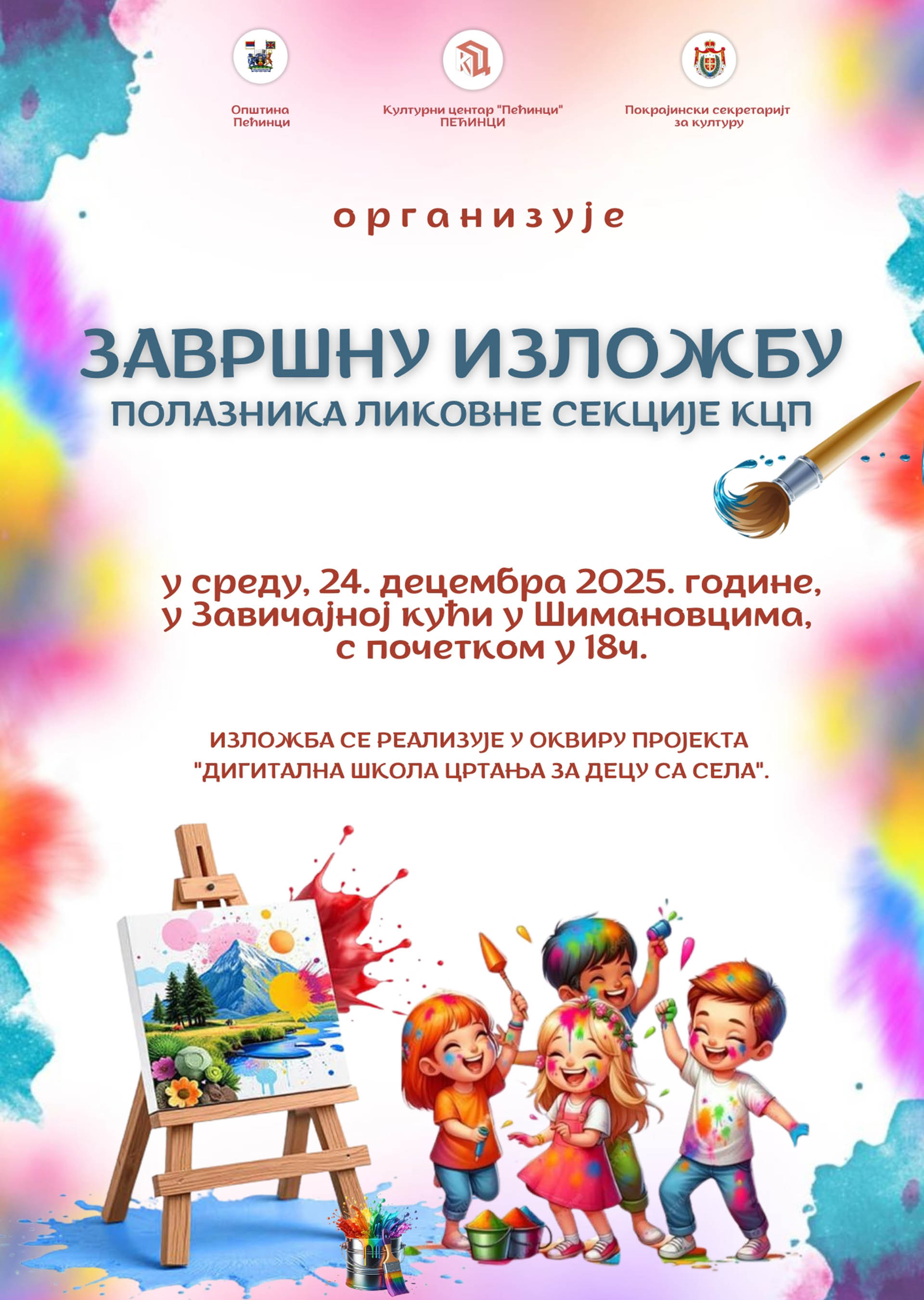 Културни центар „Пећинци“ организује завршну изложбу радова полазника Ликовне секције КЦП, у среду, 24. децембра, у Завичајној кући у Шимановцима, са почетком у 18.00 часова, уз подршку генералних покровитеља - Општине Пећинци и Покрајинског секретаријата за културу, јавно информисање и односе с верским заједницама