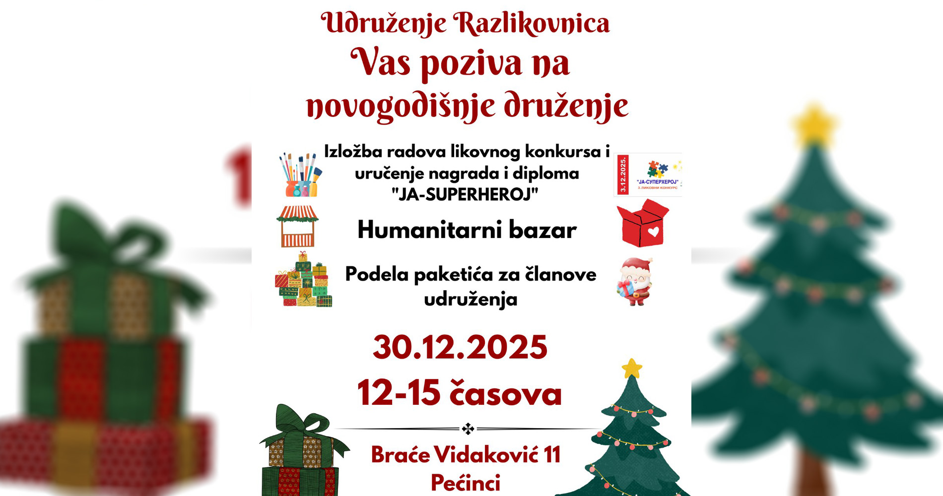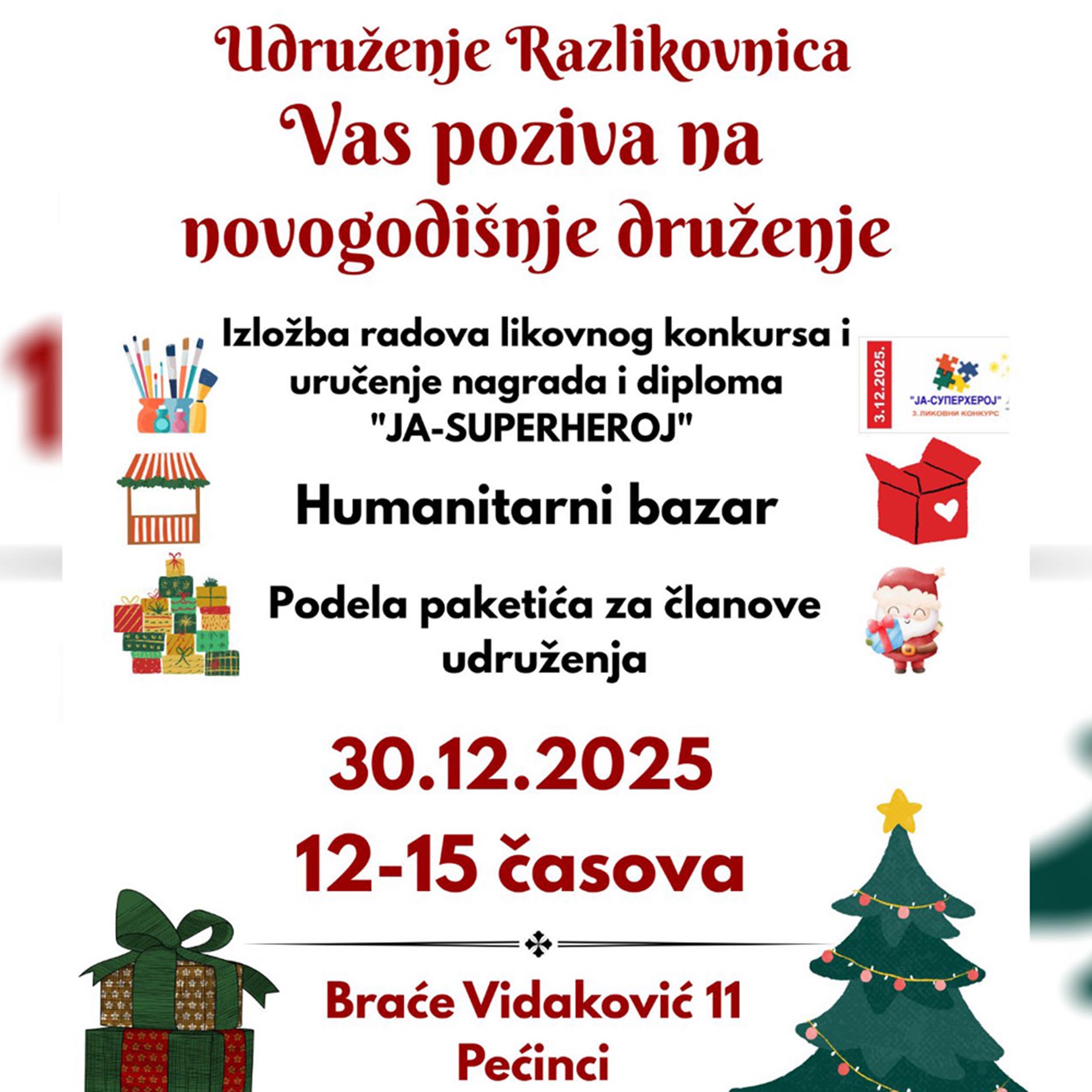 Удружење за помоћ деци и одраслима са сметњама у развоју „Разликовница“ организује у уторак, 30. децембра, новогодишње дружење у својим просторијама у Пећинцима, у улици Браће Видаковић бр. 11 , од 12.00 до 15.00 часова.