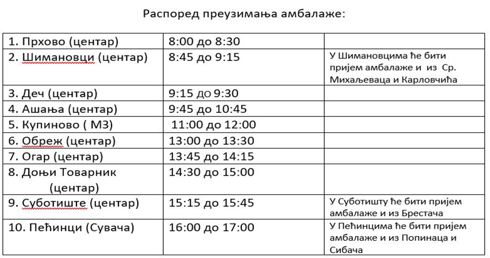 | 9.Суботиште (центар) | 15:15 до 15:45 | У Суботишту ће бити пријем амбалаже и из Брестача |