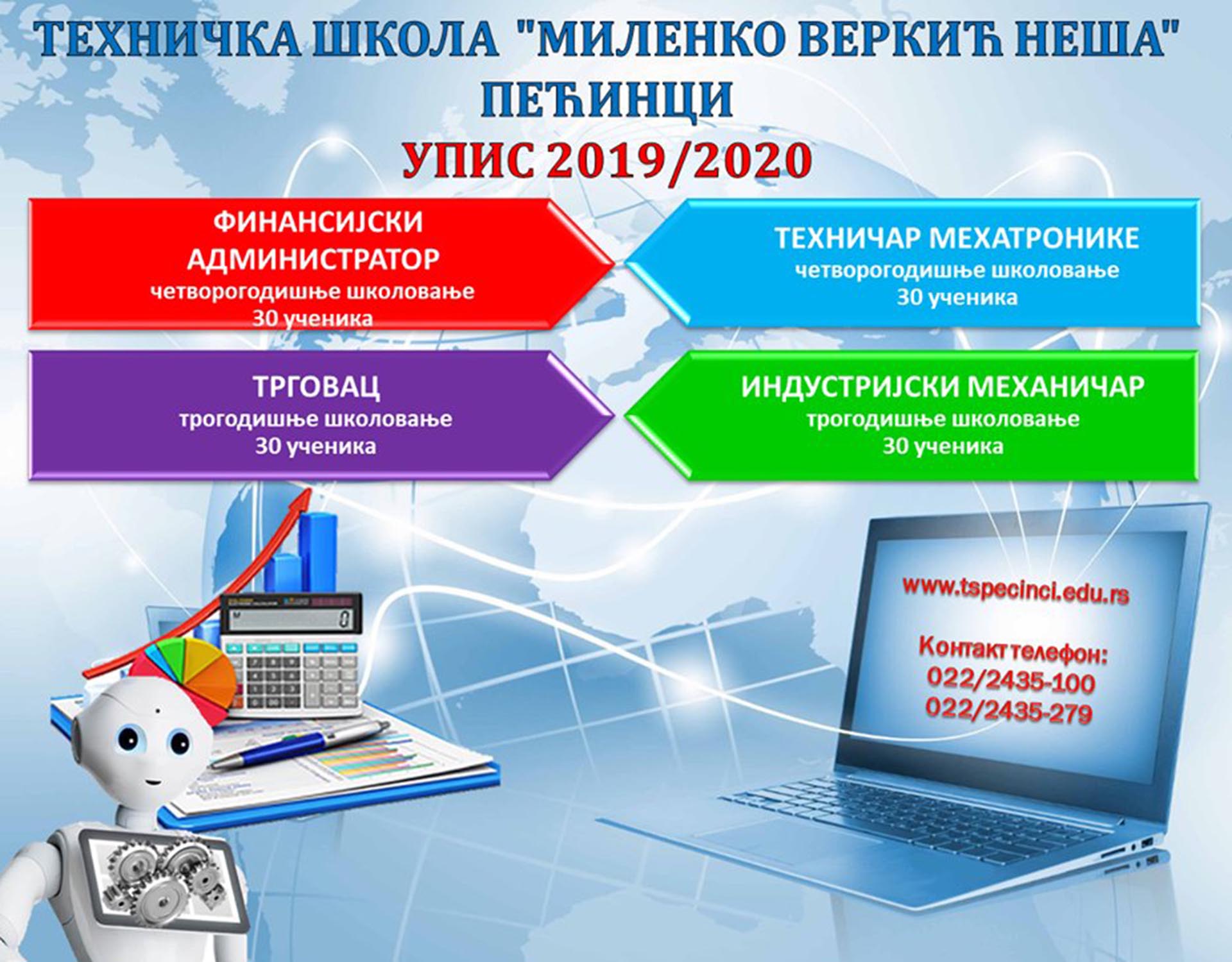 И ове године средња Техничка школа “Миленко Веркић Неша” у Пећинцима будућим средњошколцима нуди широк избор образовних профила. За наредну школску 2019/2020. годину у пећиначкој школи прилику да се образује имаће 120 ученика, током трогодишњег и четворогодишњег школовања профила Финансијски администратор, Трговац, Индустријски механичар и Техничар мехатронике.