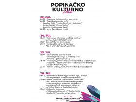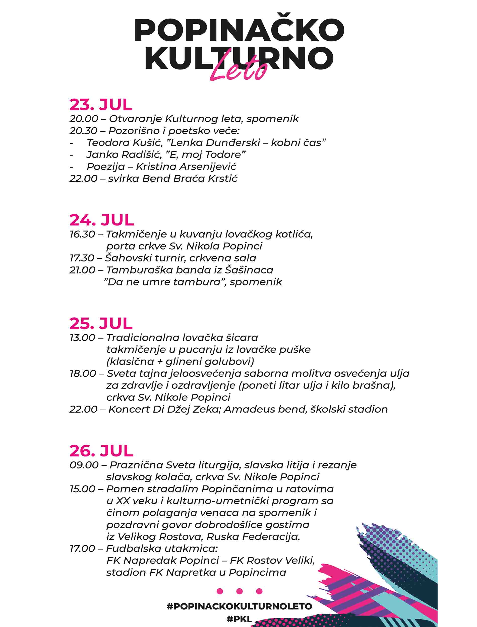 Поводом обележавања сеоске славе у Попинцима, вечерас у 20.00 часова на споменику у центру насеља почиње четвородневни програм, обједињен под називом „Попиначко културно лето“. Вечерас ће бити одржано позоришно и поетско вече, а у наредна четири дана смењиваће се бројни спортски и музички садржаји, међу којима ће свакако најзапаженији бити концерт Амадеус бенда у четвртак 25. јула од 22.00 часа.