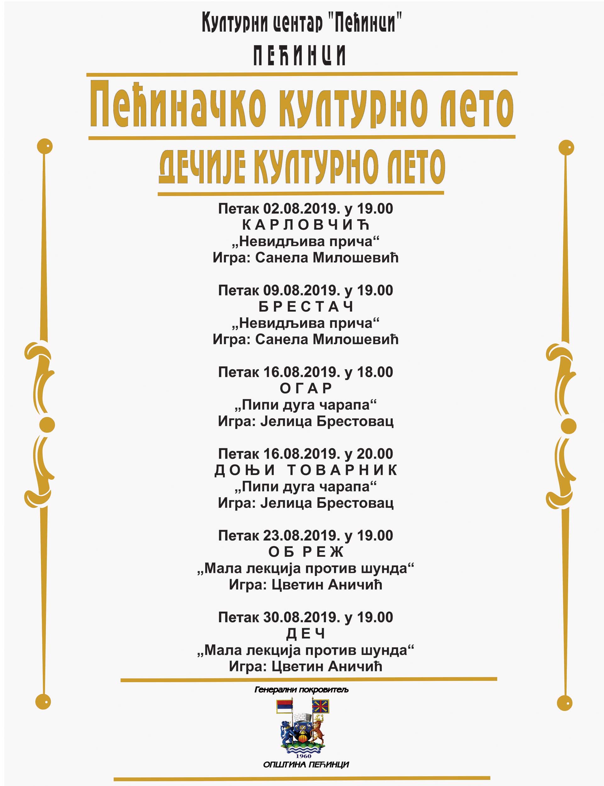 Дечје представе биће организоване у још 5 насеља пећиначке општине - Брестачу, Огару, Доњем Товарнику, Обрежу и Дечу, а најмлађи ће бити у прилици да погледају и представу „Пипи дуга чарапа“ у којој игра Јелица Брестовац и „Мала лекција против шунда“ у којој игра Цветин Аничић.