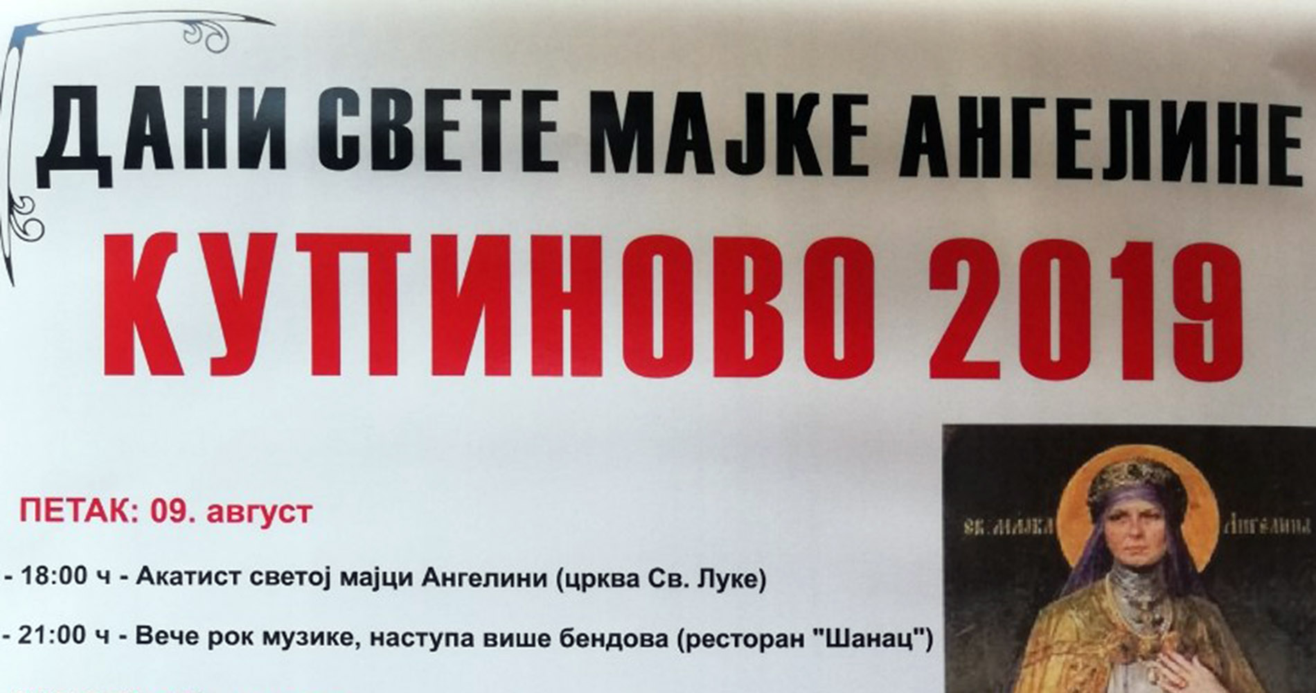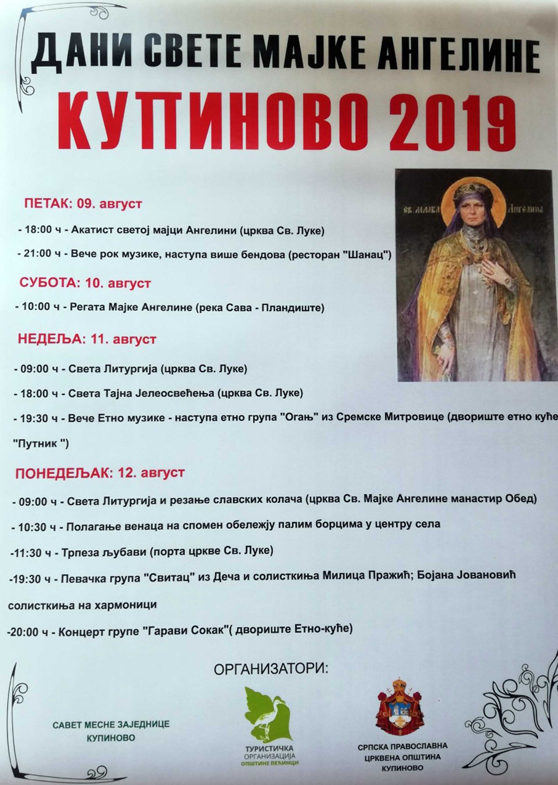 Поводом сеоске славе свете мајке Ангелине у Купинову, Савет месне заједнице овог насеља у сарадњи са Туристичком организацијом општине Пећинци, Културним центром Пећинци и Српском православном црквеном општином Купиново организује низ занимљивих догађаја за Купинце и њихове госте. Програм обележавања славе почиње вечерас у 18.00 часова Акатистом светој мајци Ангелини у цркви св. Луке, да би од 21.00 час у ресторану Шанац почело вече рок музике, током које ће наступити више бендова.