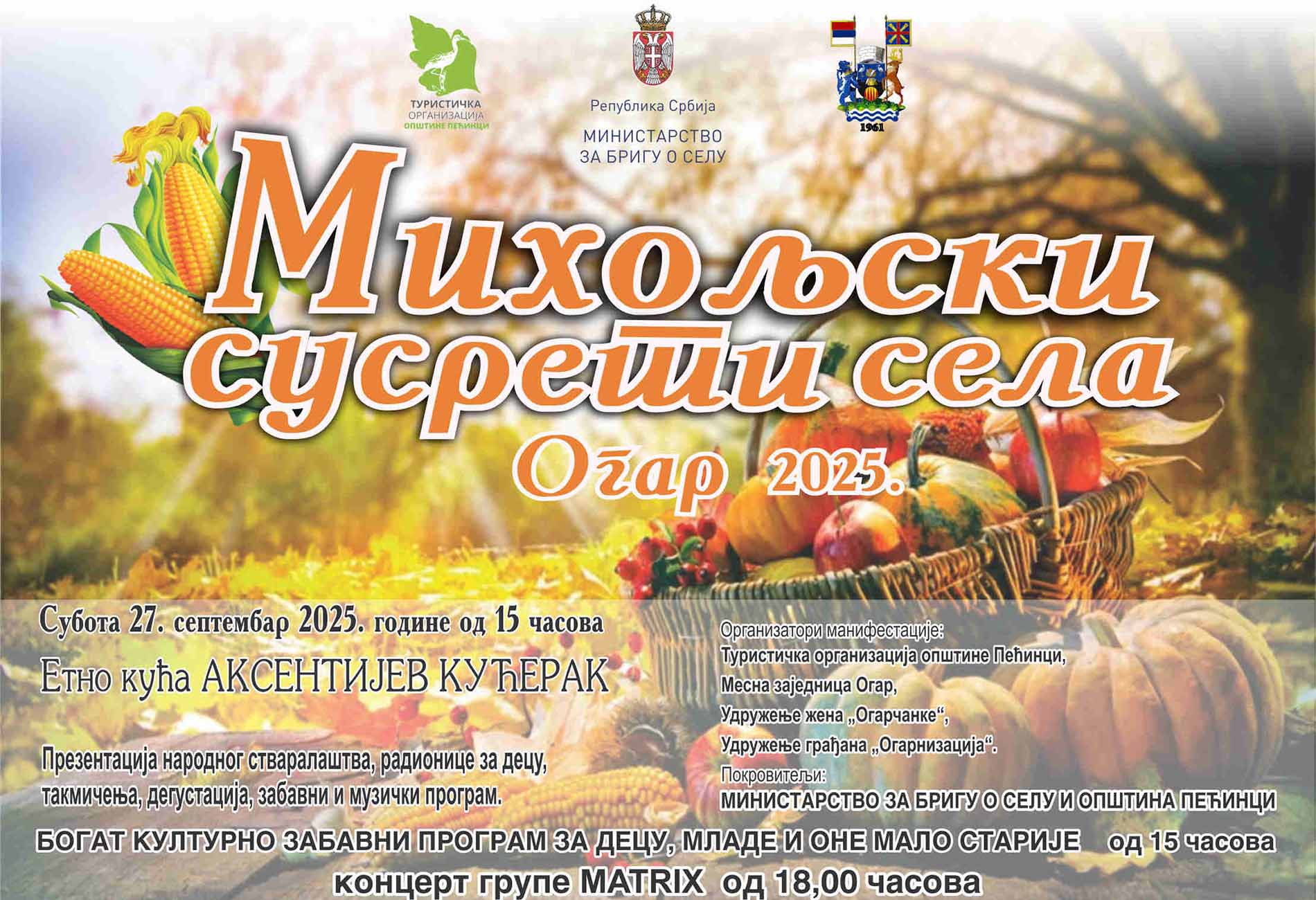 U dvorištu Aksentijevog kućerka u Ogaru Sremci će još jednom odati počast poljoprivrednoj kulturi koja ima kultni status u ovom kraju – kukuruzu, u okviru manifestacije „Miholjski susreti sela“, koju organizuje Turistička organizacija opštine Pećinci, pod pokroviteljstvom Ministarstva za brigu o selu i Opštine Pećinci.