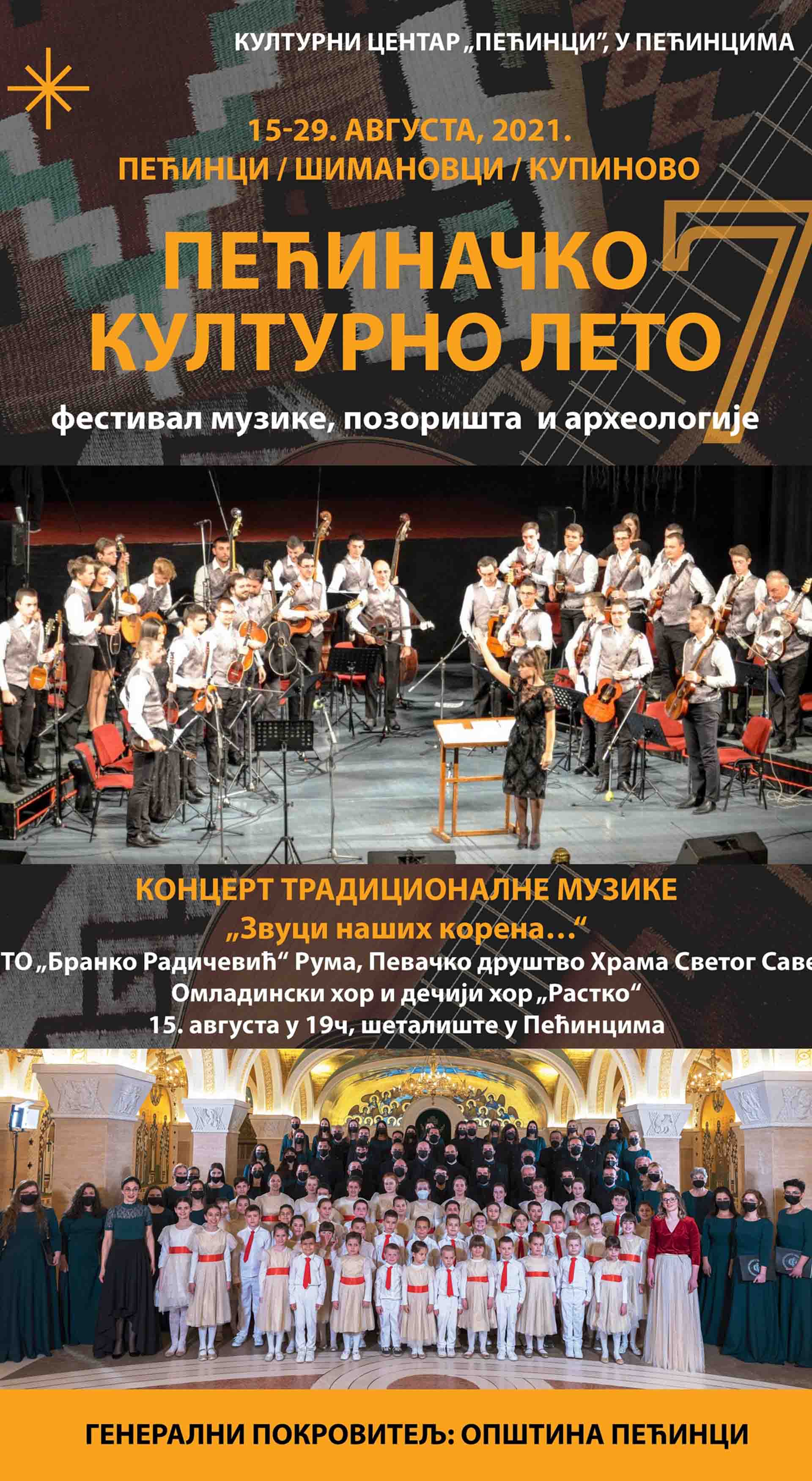 У 19.00 часова на пећиначком шеталишту почиње концерт традиционалне музике „Звуци наших корена...“, а у једночасовном програму наступиће осамдесет учесника - чланова Градског тамбурашког оркестра „Бранко Радичевић“ из Руме заједно са члановима хора „Мокрањац“, хора „Храма Светог Саве“, дечјег хора „Растко“ и Омладинског хора који функционишу при Певачком друштву Храма Светог Саве у Београду.