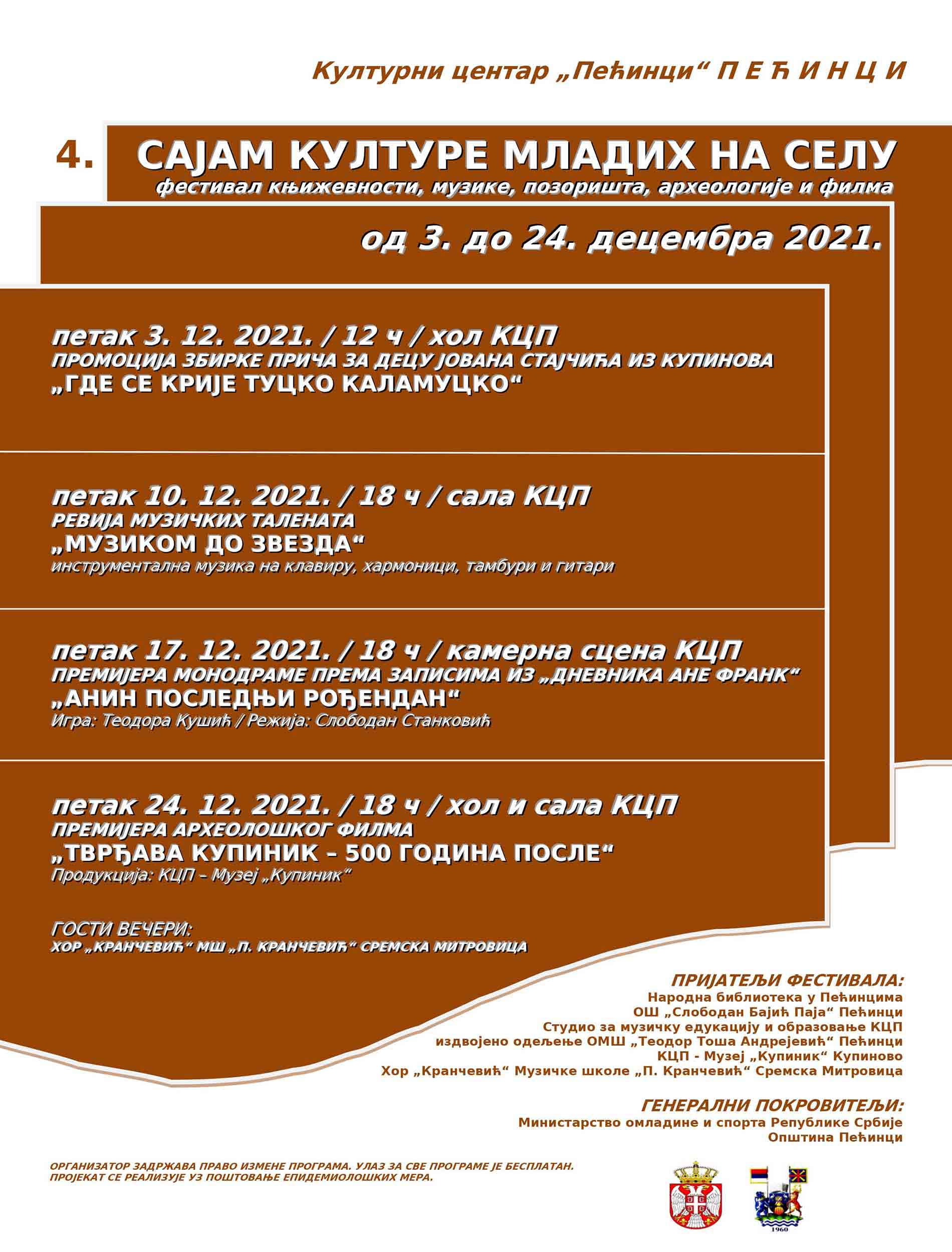 „Сајам културе младих на селу“ који се ове године реализује по четврти пут у организацији пећиначког Културног центра под покровитељством Министарства културе и информисања Републике Србије и Општине Пећинци одржаће се од 3. до 24. децембра. Љубитељи књижевности, музике, позоришта, археологије и филма биће у прилици да уживају у промоцији збирке прича за децу, концертима инструменталне и духовне музике, монодрами и археолошком филму.