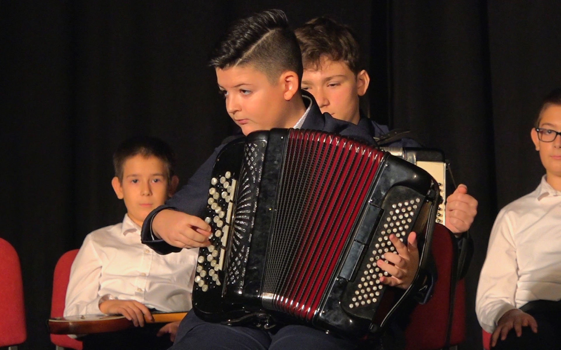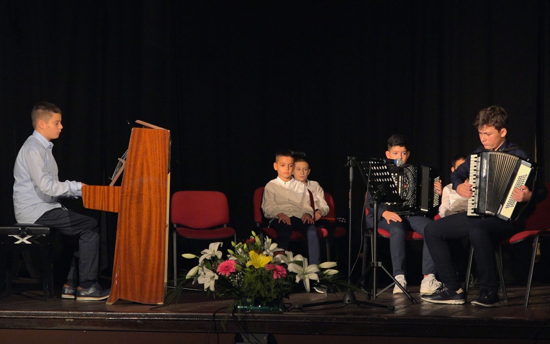 Програм је отворио деветогодишњи Марко Плавшић из Пећинаца који је на клавиру извео композицију под називом „Матадор“ Џејмса Бастиена, а поред њега у првом делу програма наступили су и тринаестогодишњи Андреј Станисављевић из Пећинаца који је на тамбури извео Етиду у Х-молу Дмитрија Кабалевског, деветогодишња Милица Михајловић из Купинова која се на клавиру представила Етидом у A-молу Лудвига Шитеа и десетогодишњи Вељко Плавшић из Пећинаца који је на хармоници извео народну песму „Милица је вечерала“.