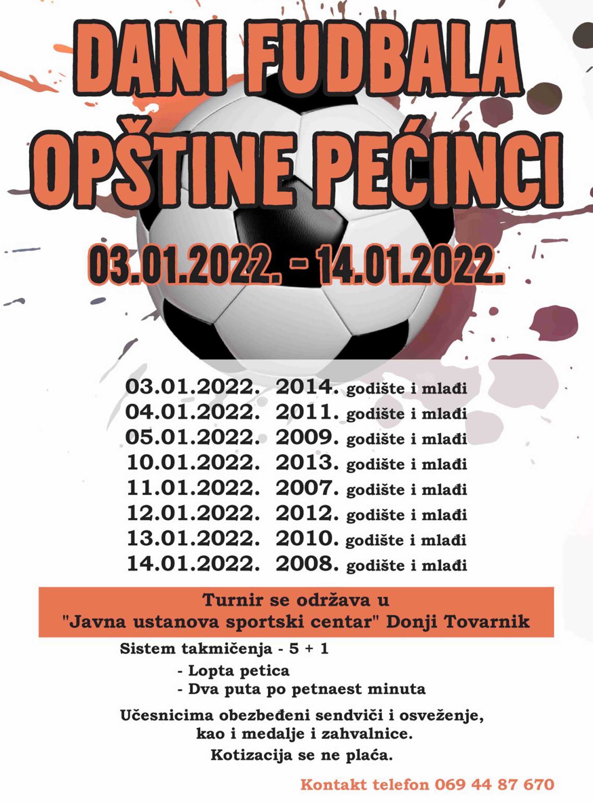 Под покровитељством Спортског савеза „Развој спортова“, од 3. до 14. јануара 2022. године, у Спортској хали у Доњем Товарнику биће одржани „Дани фудбала општине Пећинци“.