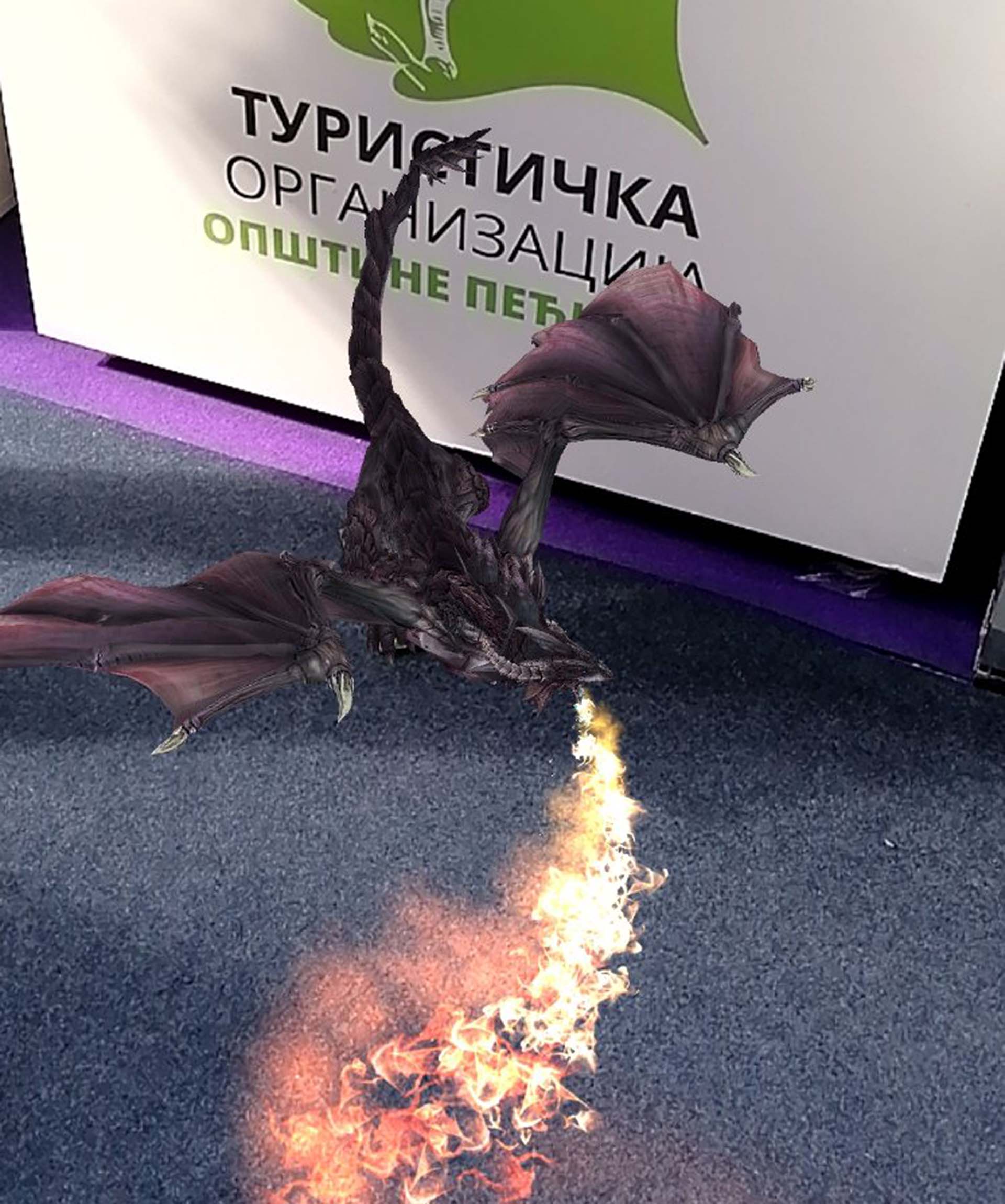 Наиме, сви посетиоци сајма који су узели разгледницу ТО Пећинци могли су у тзв. проширеној реалности уживо да се упознају са Змајем од Купиника, па чак и да се са њим фотографишу за успомену, а све то путем апликације Холоград.