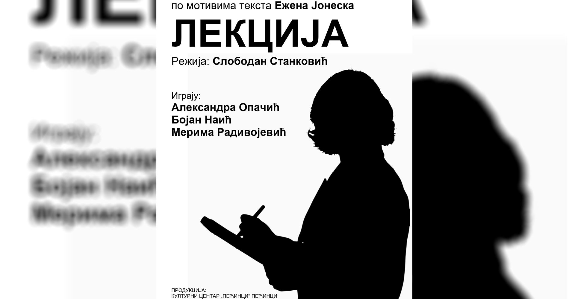 Љубитељи позоришне уметности могу погледати представу Лекција у недељу 10. априла, у 20.00 часова, а улаз је слободан