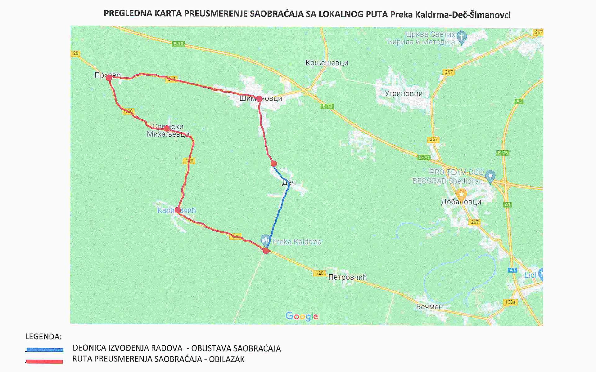 Због асфалтирања пута Прека Калдрма – Деч у пуној ширини коловоза, у периоду од 13. до 20. маја биће обустављен саобраћај на путу Шимановци – Прека Калдрма, деоница Прека Калдрма – Деч (раскрница улица Палих бораца, Војвођанске и Браће Савић).