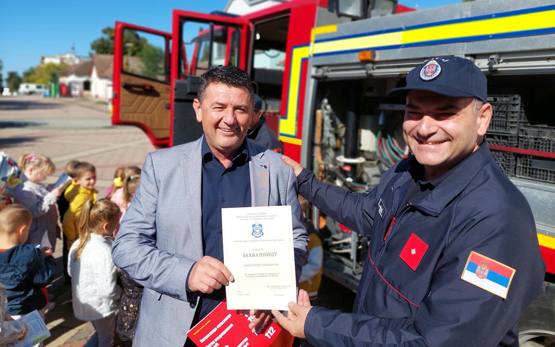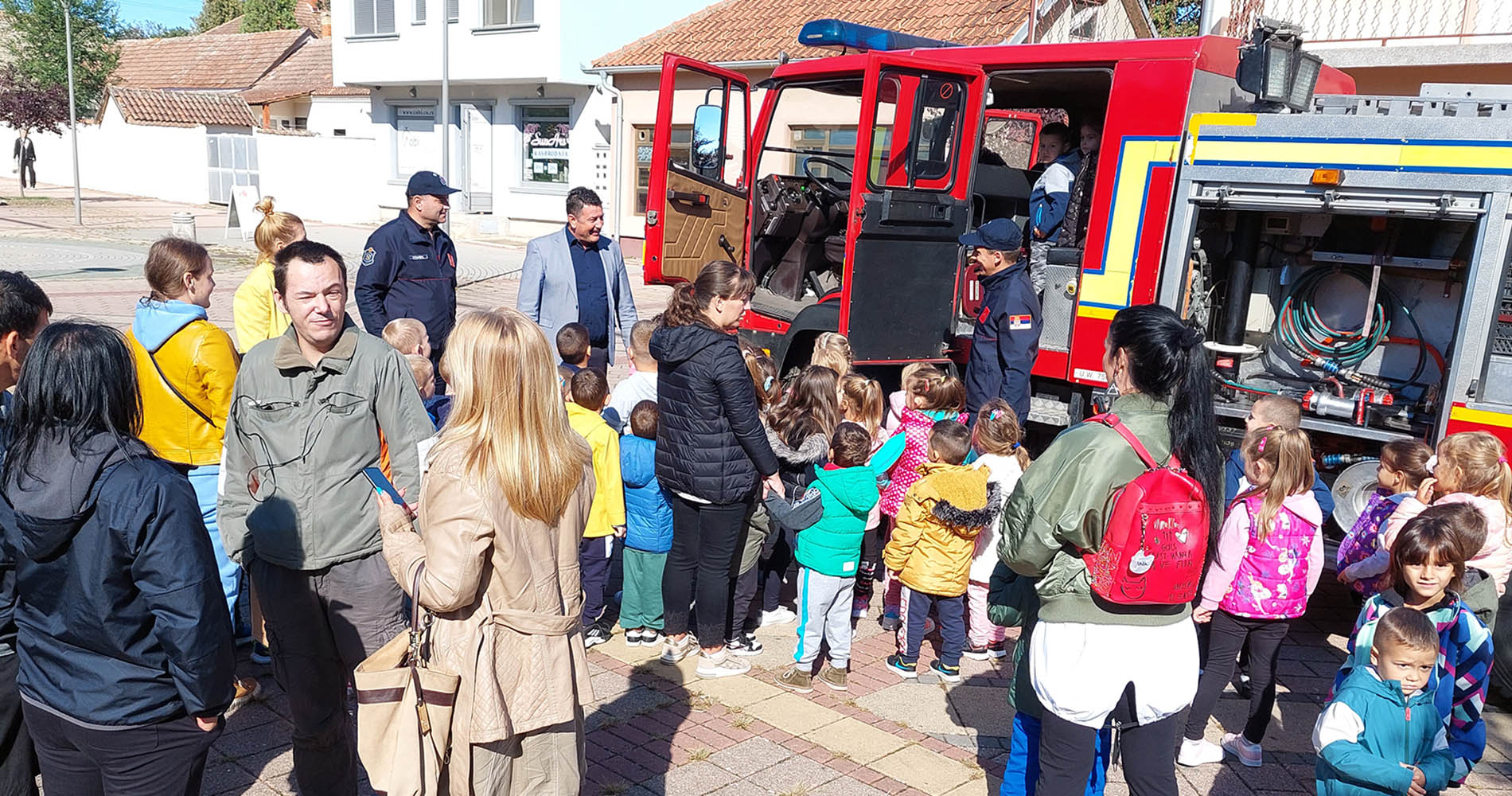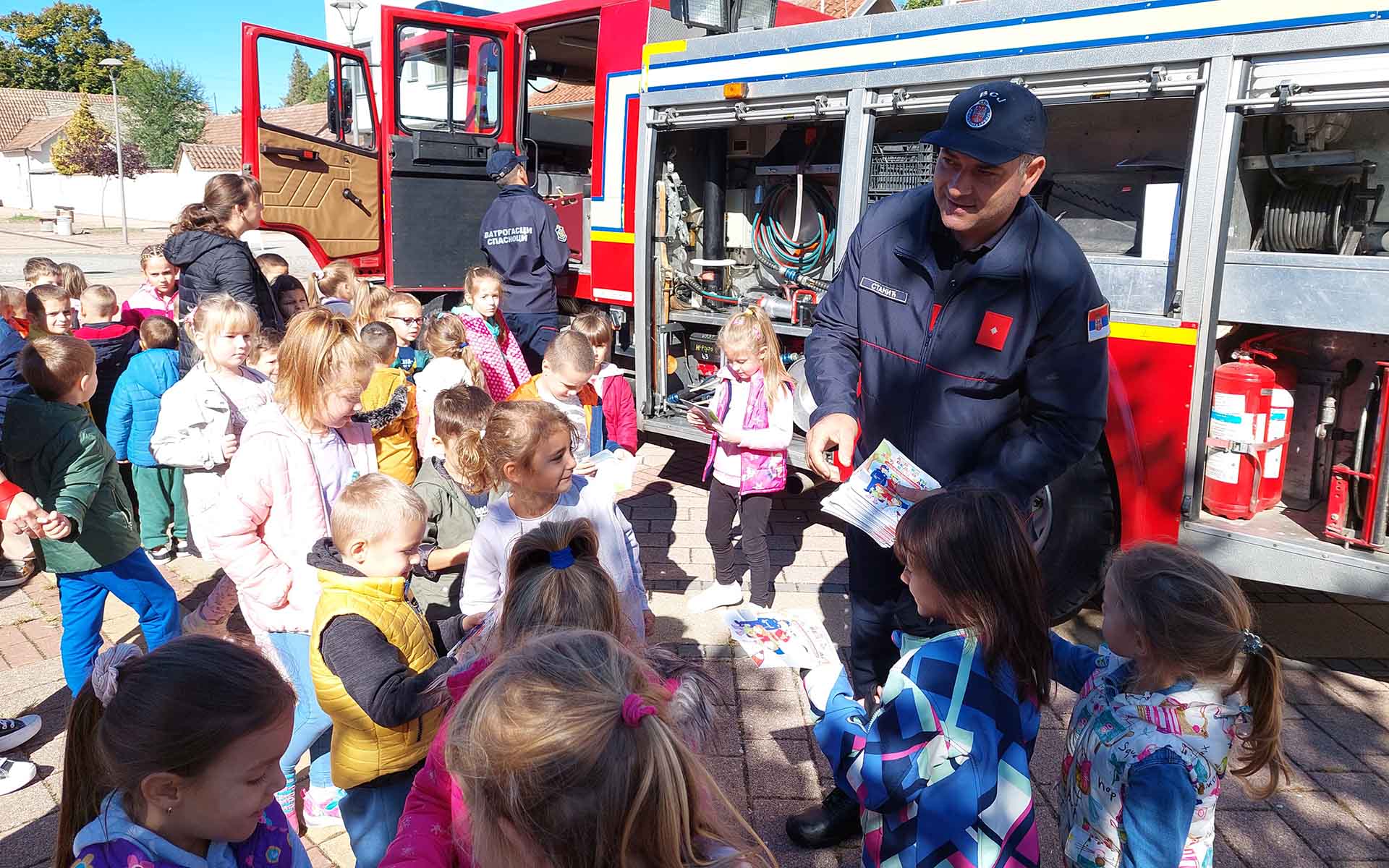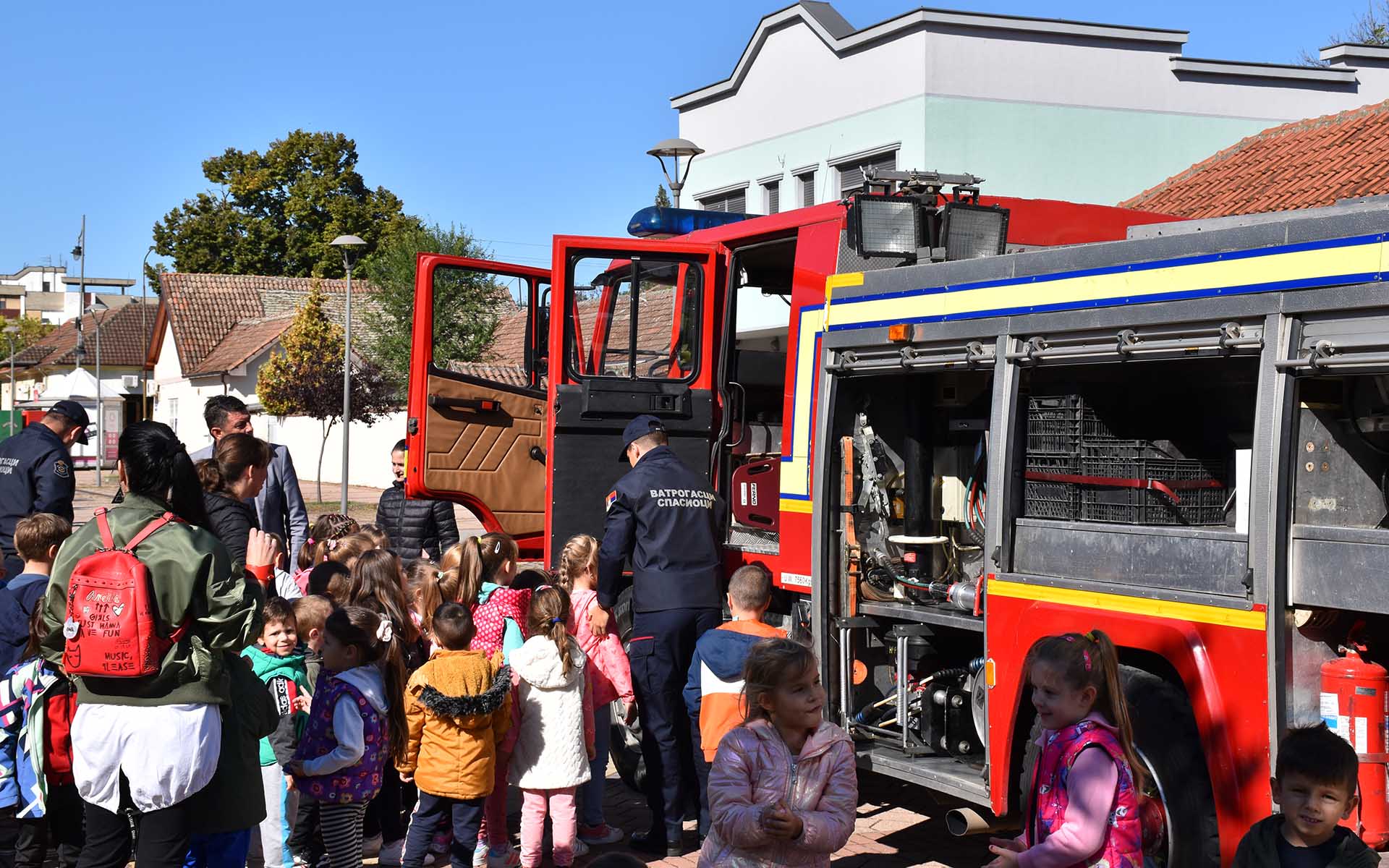Деца и грађани су били у прилици да разгледају ватрогасно возило и опрему, а ватрогасци су деци поделили промотивни материјал Породични приручник за понашање у ванредним ситуацијама, као и бојанку за најмлађе Азбуку безбедности за ђаке прваке.