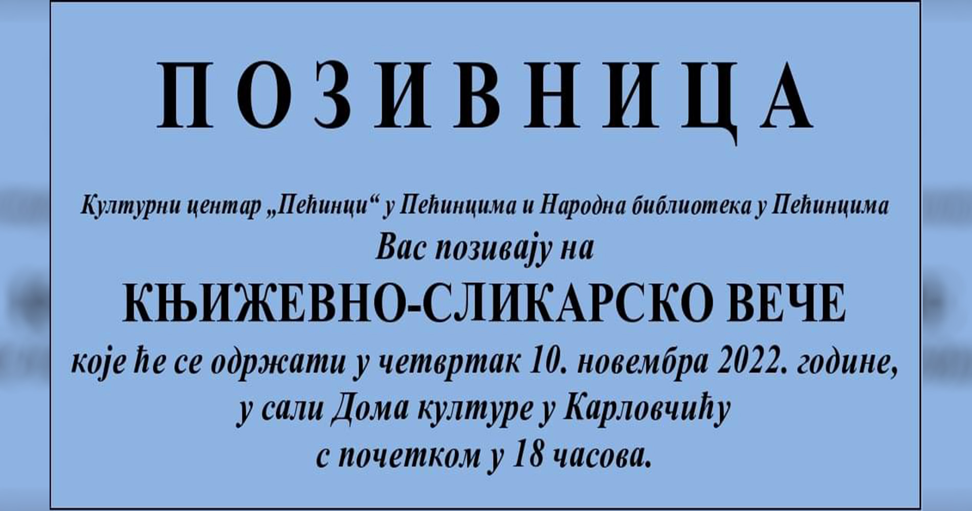 Културни центар Пећинци и пећиначка Народна библиотека организују Књижевно-сликарско вече у четвртак, 10. новембра, у сали Дома културе у Карловчићу са почетком у 18.00 часова.