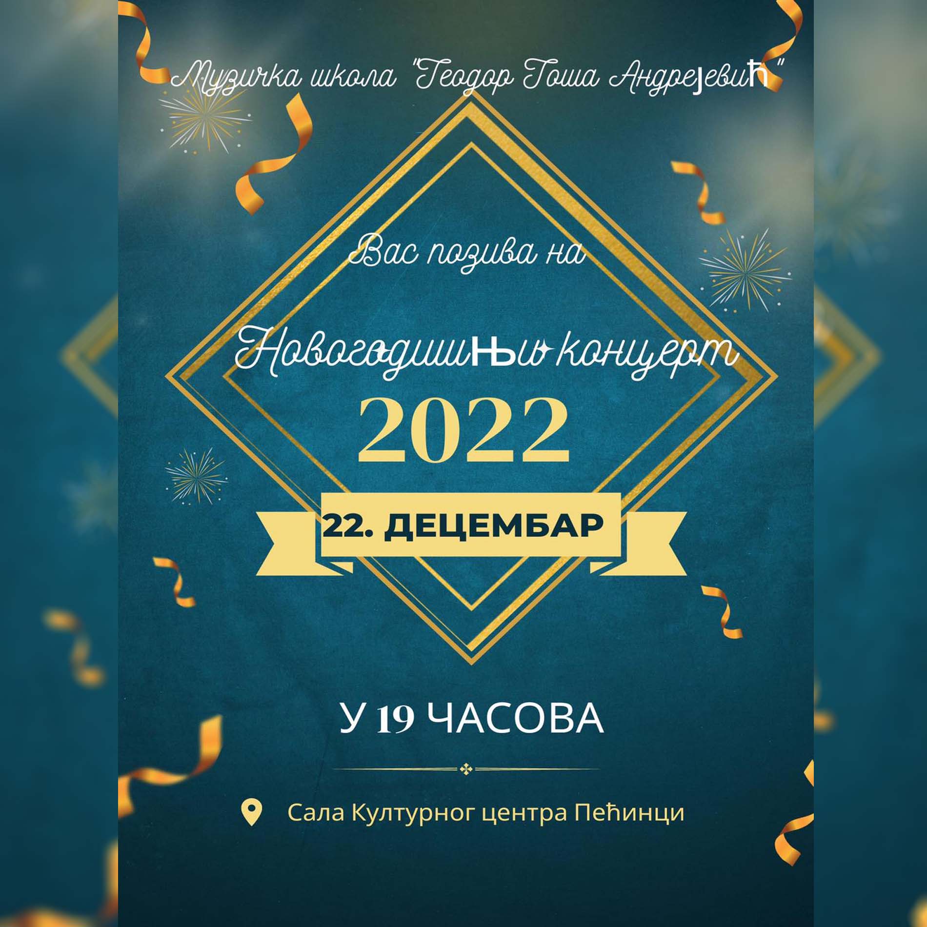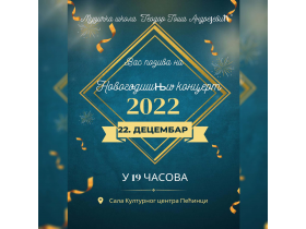 Музичка школа "Теодор Тоша Андрејевић" већ трећу годину за редом организује целовечерњи Новогодишњи концерт. Концерт је заказан за четвртак, 22. децембар, са почетком у 19.00 часова, у сали Културног центра Пећинци.