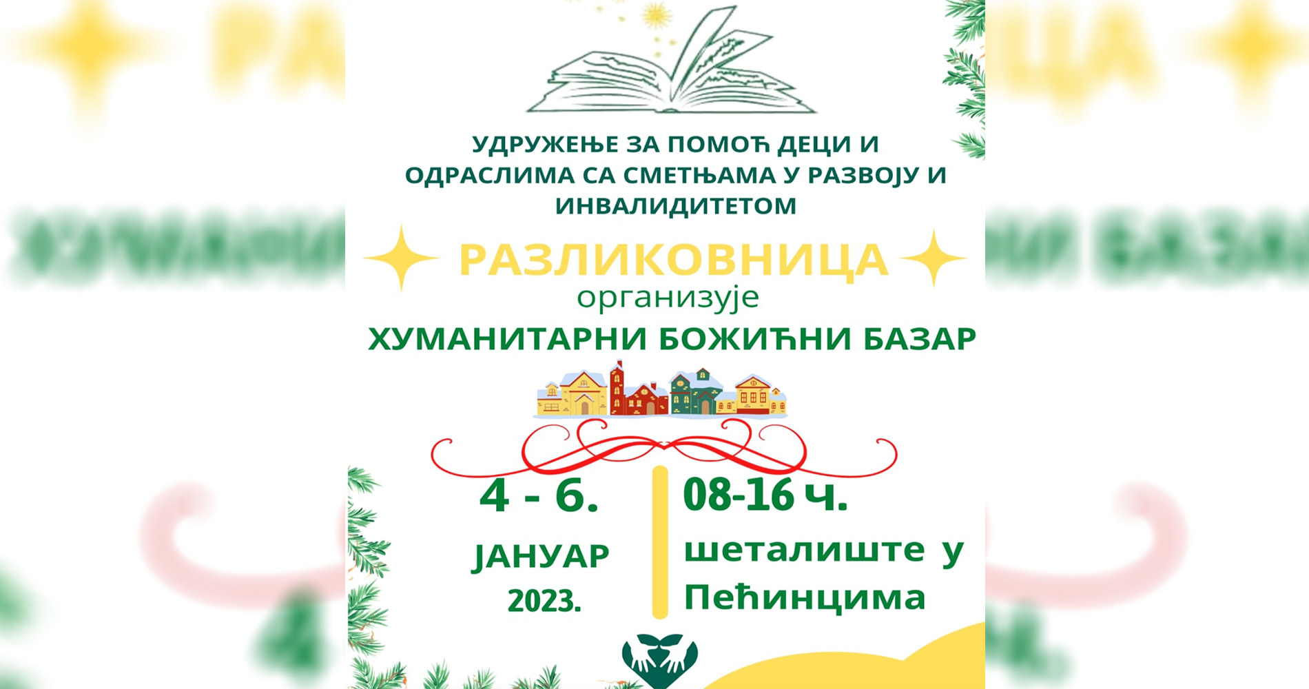 Новогодишњи и божићни празници су време даривања, време када смо посебно окренути једни другима. Са тим циљем, новоосновано Удружење за помоћ деци и одраслима са сметњама у развоју и инвалидитетом “Разликовница” из Пећинаца, организује хуманитарни божићни базар, током којег ће на пећиначком шеталишту продавати домаће производе, накит, књиге, едукативни материјал и још понешто.