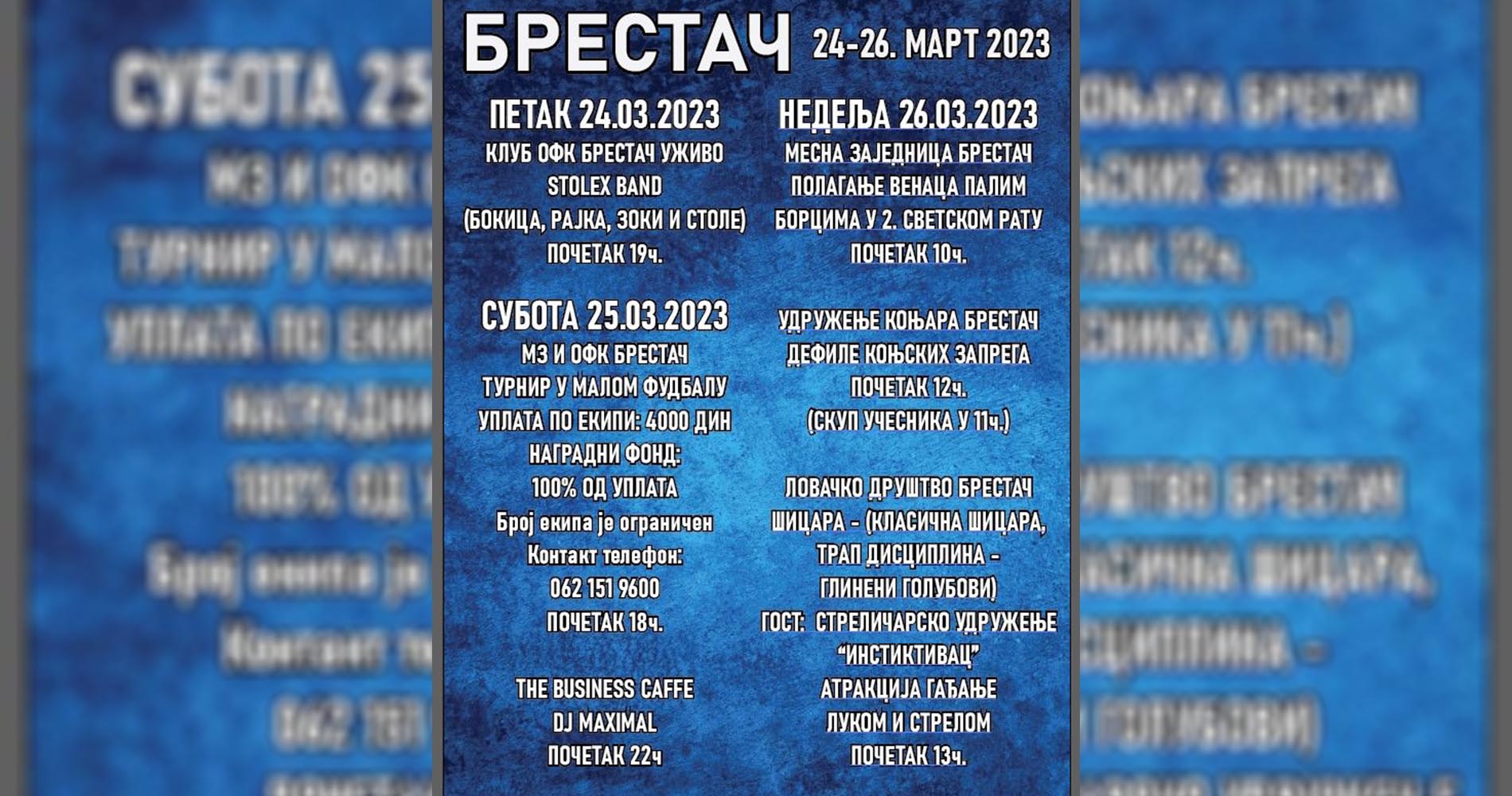 Спортска дешавања настављају се и у недељу, 26. марта, када ће удружење коњара из овог насеља одржати дефиле коњских запрега у 12.00 часова, а Ловачко друштво Брестач у 13.00 часова организује шицару, са гостима члановима Стреличарског удружења “Инстинктивац”. Полагање венаца на спомен обележје палим борцима у Другом светском рату резервисано је за преподневне сате, а почетак је заказан за 10.00 часова.